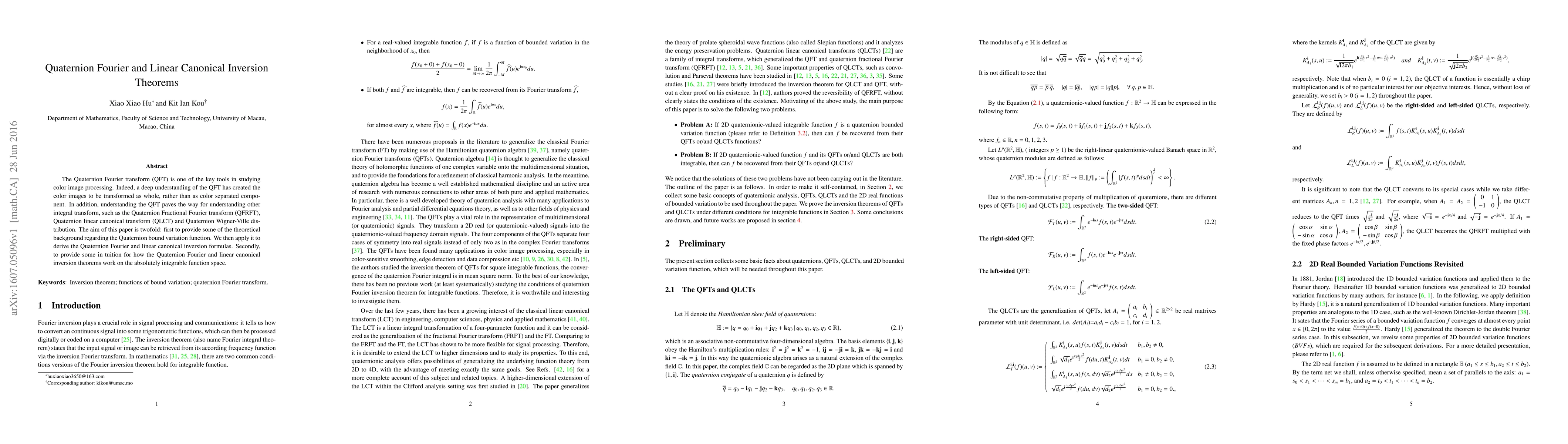 This paper explores the theoretical foundations of the Quaternion Fourier transform (QFT) and its applications in color image processing. It derives the Quaternion Fourier and linear canonical inversion formulas, providing insights into their functionality on absolutely integrable function spaces.