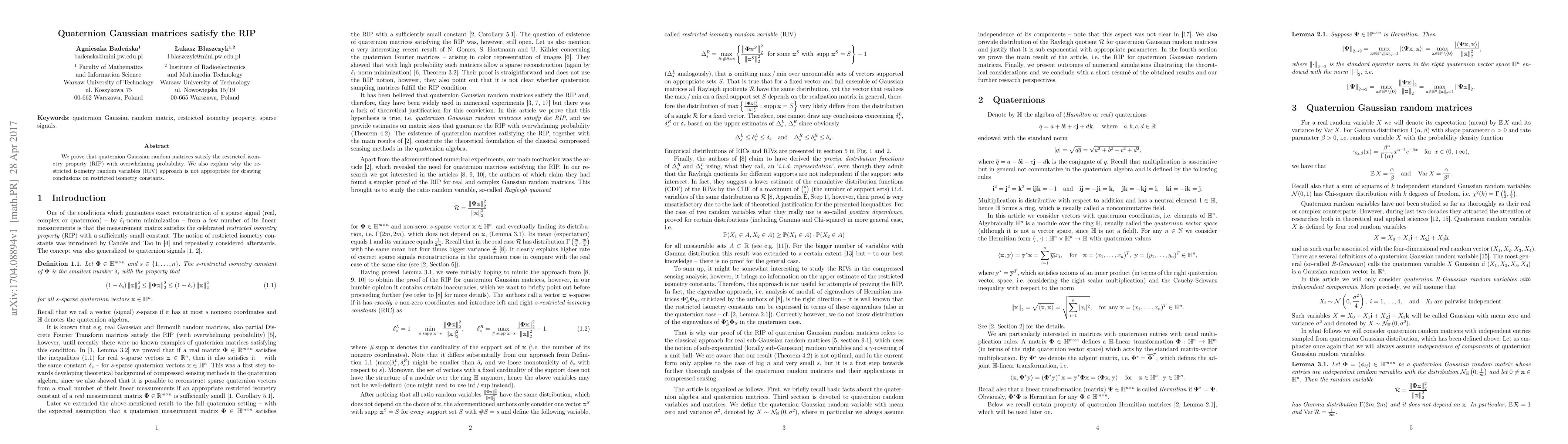 Summary: This paper demonstrates that quaternion Gaussian random matrices fulfill the restricted isometry property (RIP) with high probability, while noting that the RIV approach is inadequate for determining precise RIP constants.