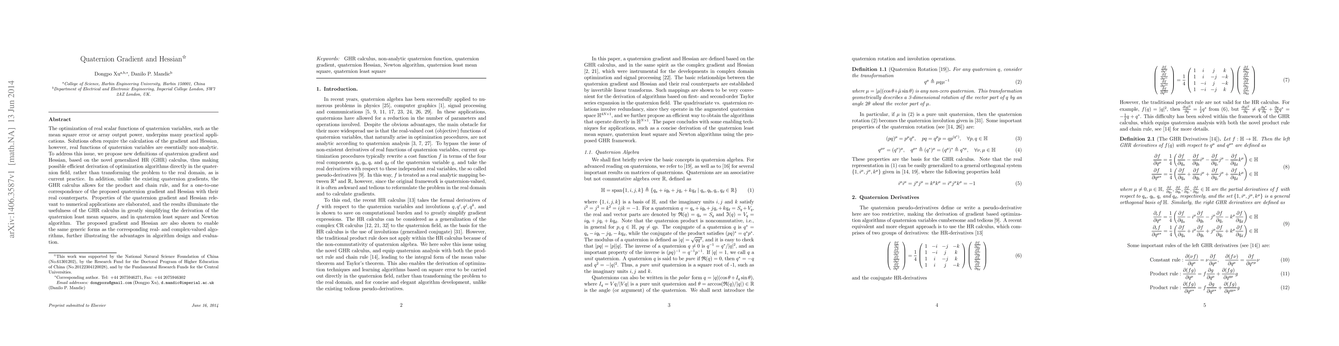This paper introduces new definitions of quaternion gradient and Hessian based on the generalized HR (GHR) calculus, enabling efficient optimization algorithms directly in the quaternion field. The GHR calculus facilitates the product and chain rule, and simplifies the derivation of quaternion least mean squares, least square, and Newton algorithms.