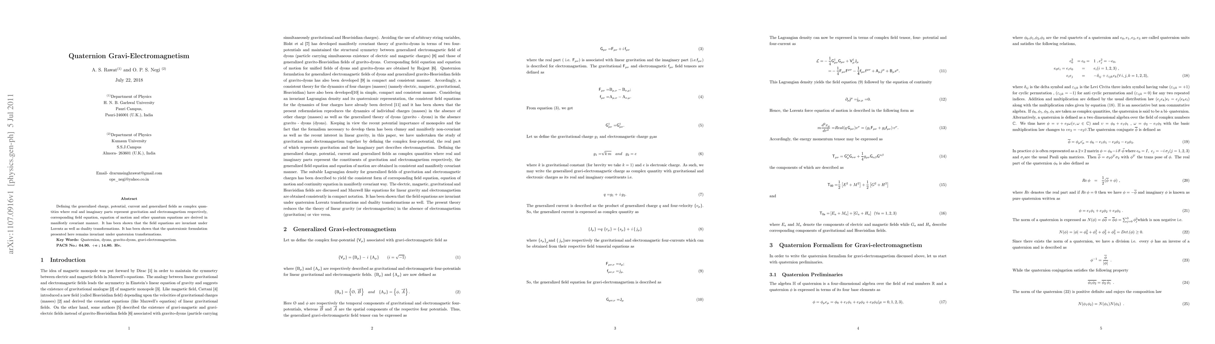 This paper proposes a quaternionic framework for unifying gravity and electromagnetism, where generalized charge and fields are represented as complex quantities. The derived field equations and quantum equations are invariant under Lorentz, duality, and quaternion transformations.