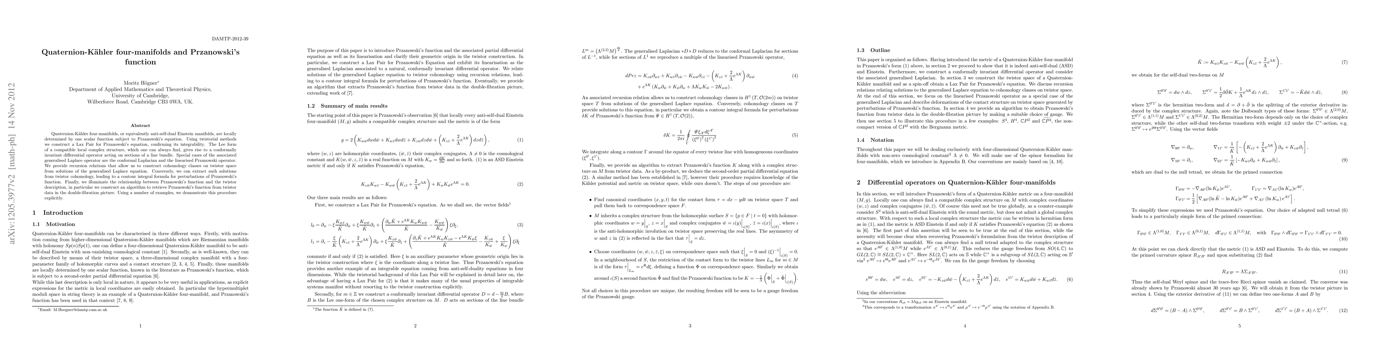 This paper presents a Lax Pair for Przanowski's equation, proving its integrability in quaternion-Kaehler four-manifolds. It introduces a conformally invariant differential operator, explores recursion relations for cohomology classes, and develops an algorithm to extract Przanowski's function from twistor data, demonstrated via examples.