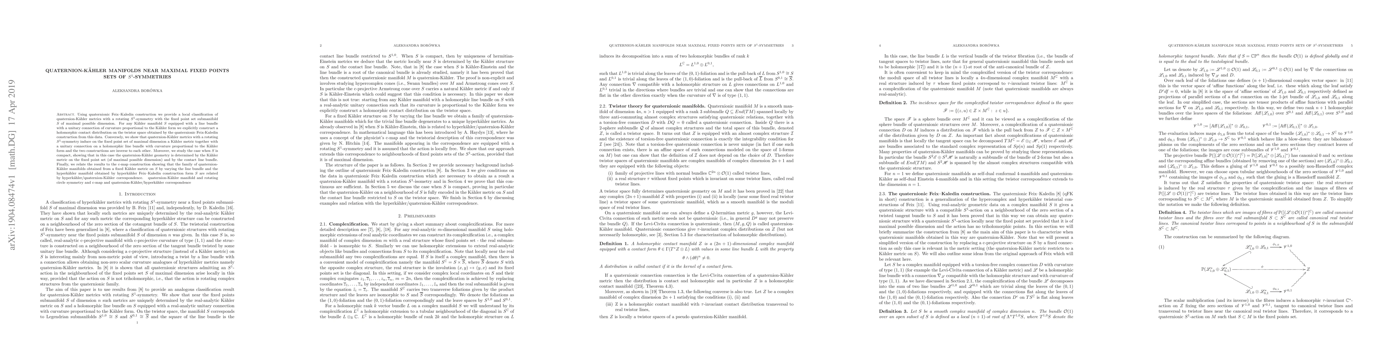 The paper classifies quaternion-Kähler metrics with $S^1$ symmetries near maximal fixed point sets using the quaternionic Feix-Kaledin construction. It shows a correspondence between these metrics and Kähler metrics on the fixed point set, establishing an inverse relationship between the constructions and determining quaternion-Kähler geometry when the fixed point set is compact.