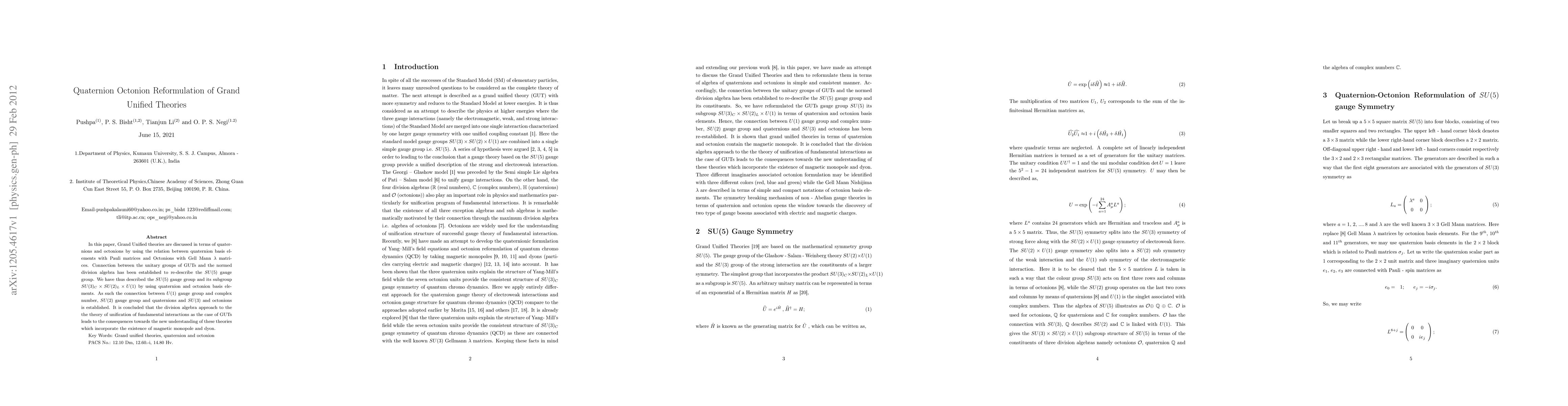 This paper reformulates Grand Unified Theories (GUTs) using quaternions and octonions, linking quaternion basis elements to Pauli matrices and octonions to Gell-Mann matrices. It establishes a connection between the unitary groups of GUTs and normed division algebra, re-describing the SU(5) gauge group and its subgroups, and introduces a new understanding of GUTs incorporating magnetic monopoles and dyons.