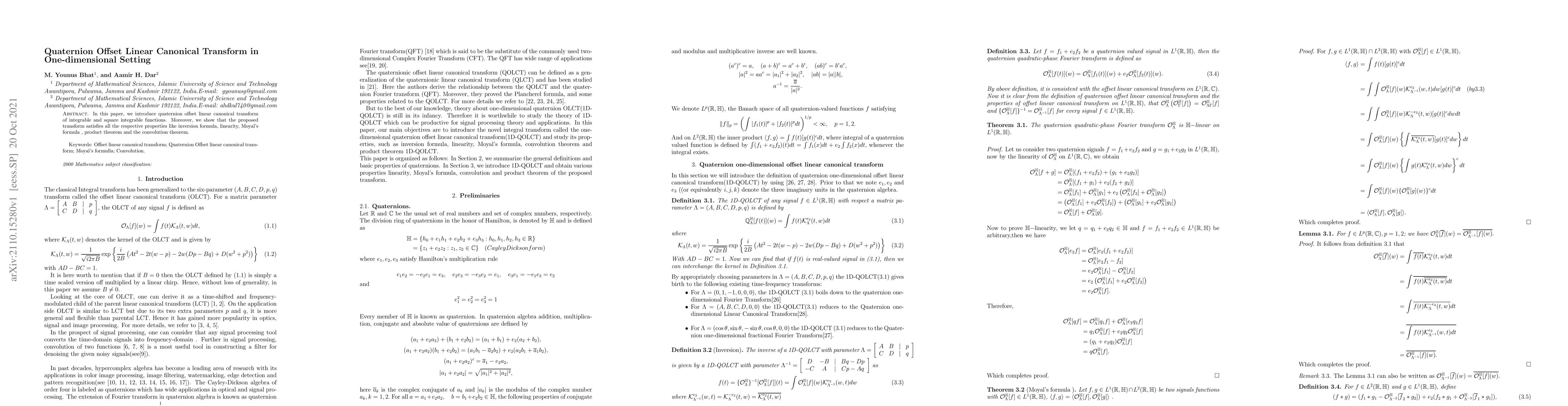 This paper introduces a quaternion offset linear canonical transform for one-dimensional functions, showing it satisfies various properties like inversion and convolution theorems, with implications for integrable and square-integrable function analysis.