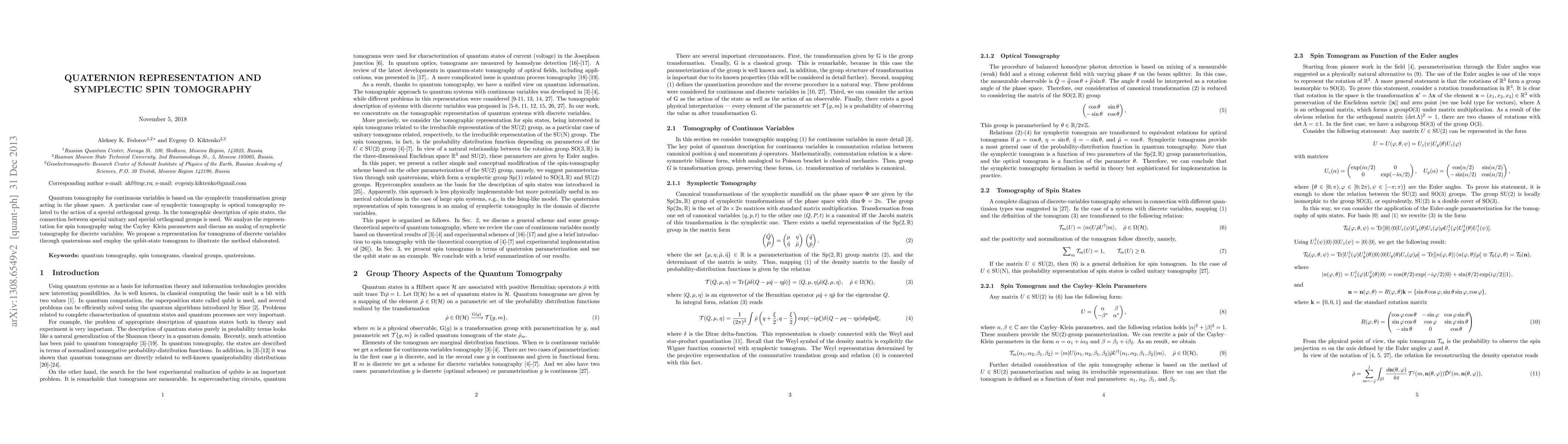 Quantum tomography for continuous variables is based on the symplectic transformation group acting in the phase space. A particular case of symplectic tomography is optical tomography related to the action of a special orthogonal group. In the tomographic description of spin states, the connection between special unitary and special orthogonal groups is used. We analyze the representation for spin tomography using the Cayley-Klein parameters and discuss an analog of symplectic tomography for discrete variables. We propose a representation for tomograms of discrete variables through quaternions and employ the qubit-state tomogram to illustrate the method elaborated.