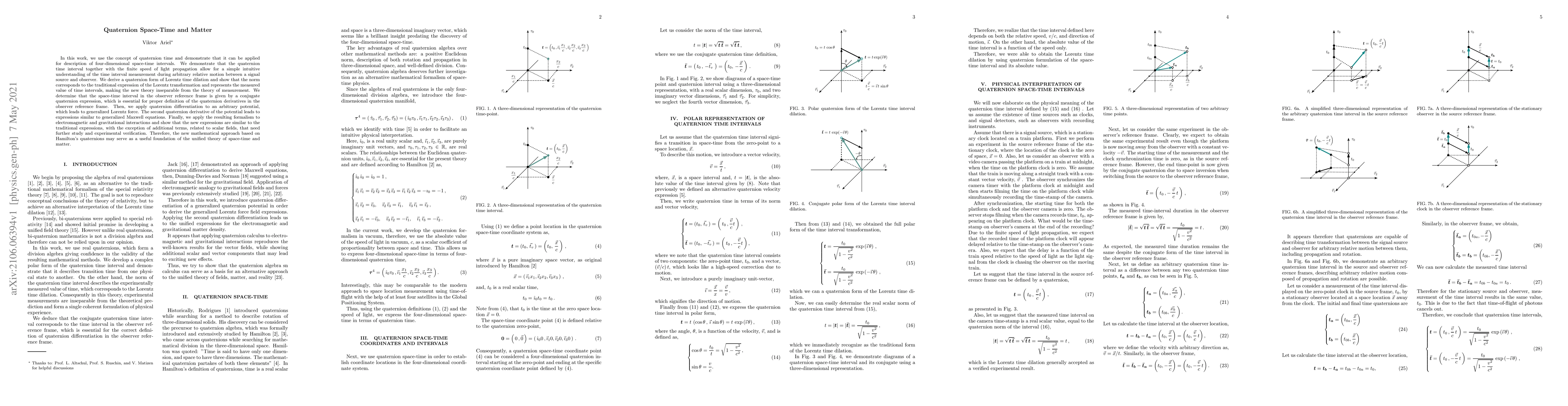 In this work, we use the concept of quaternion time and demonstrate that it can be applied for description of four-dimensional space-time intervals. We demonstrate that the quaternion time interval together with the finite speed of light propagation allow for a simple intuitive understanding of the time interval measurement during arbitrary relative motion between a signal source and observer. We derive a quaternion form of Lorentz time dilation and show that the norm corresponds to the traditional expression of the Lorentz transformation and represents the measured value of time intervals, making the new theory inseparable from the theory of measurement. We determine that the space-time interval in the observer reference frame is given by a conjugate quaternion expression, which is essential for proper definition of the quaternion derivatives in the observer reference frame. Then, we apply quaternion differentiation to an arbitrary potential, which leads to generalized Lorentz force. The second quaternion derivative of the potential leads to expressions similar to generalized Maxwell equations. Finally, we apply the resulting formalism to electromagnetic and gravitational interactions and show that the new expressions are similar to the traditional expressions, with the exception of additional terms, related to scalar fields, that need further study and experimental verification. Therefore, the new mathematical approach based on Hamilton's quaternions may serve as a useful foundation of the unified theory of space-time and matter.