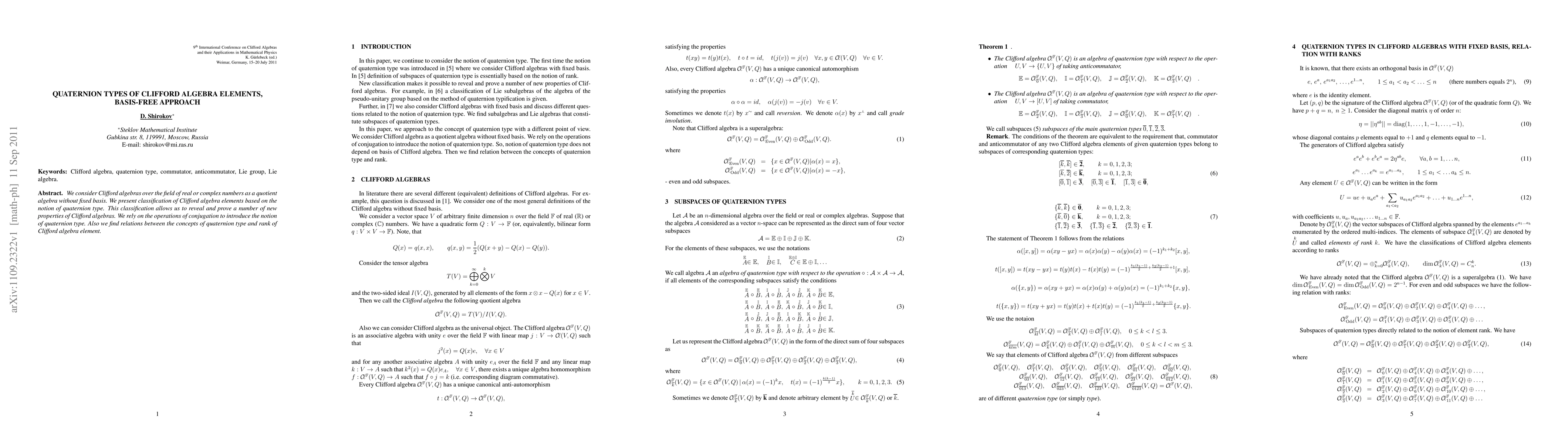 This paper classifies elements of Clifford algebras using a basis-free approach based on quaternion types, revealing new properties through conjugation operations and linking quaternion type with the rank of elements.