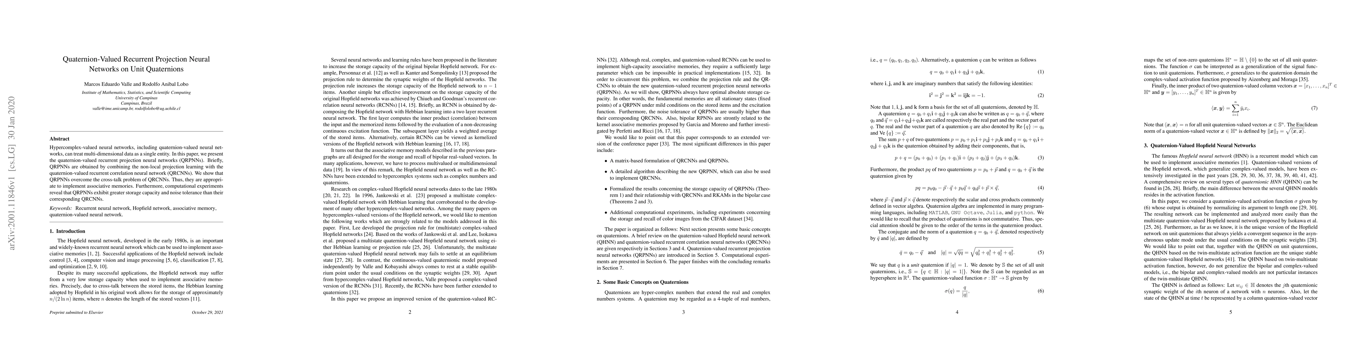 This paper introduces quaternion-valued recurrent projection neural networks (QRPNNs), combining non-local projection learning with quaternion-valued recurrent correlation neural networks (QRCNNs) to enhance storage capacity and noise tolerance while overcoming the cross-talk problem of QRCNNs.