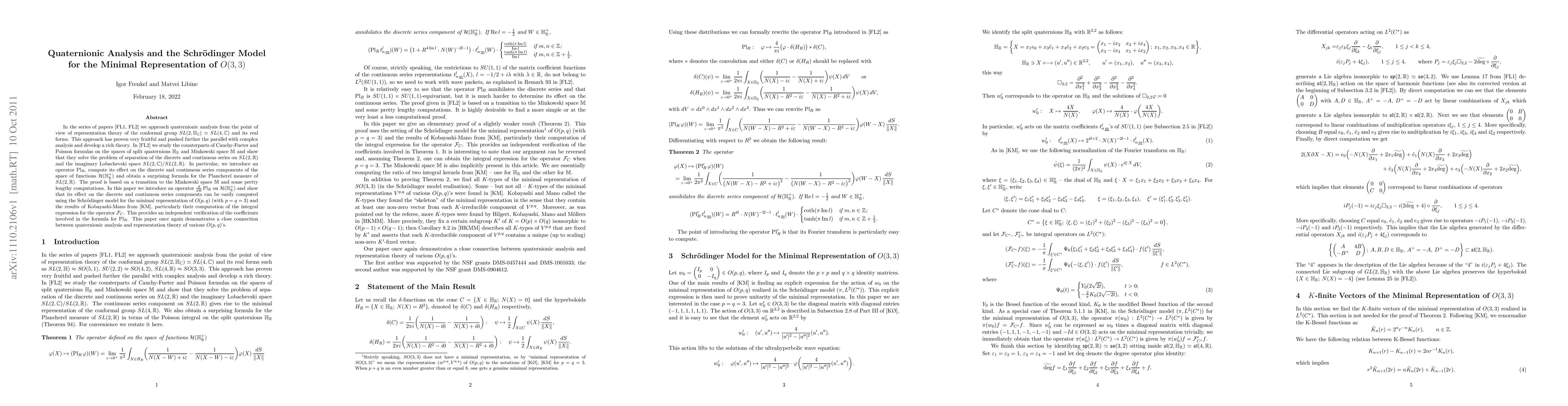 This paper extends the quaternionic analysis approach to the minimal representation of O(3,3) using the Schrödinger model, verifying the coefficients of the operator Pl_R through computations based on the results of Kobayashi-Mano. It highlights the connection between quaternionic analysis and representation theory of O(p,q) spaces.