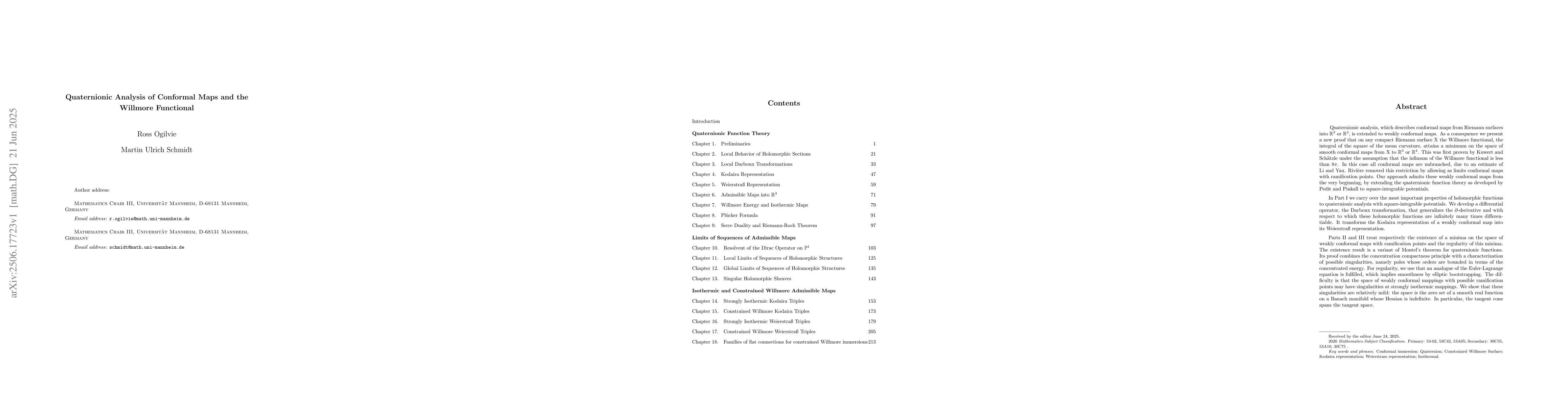Quaternionic analysis, which describes conformal maps from Riemann surfaces into $\mathbb{R}^3$ or $\mathbb{R}^4$, is extended to weakly conformal maps. As a consequence we present a new proof that on any compact Riemann surface $X$ the Willmore functional, the integral of the square of the mean curvature, attains a minimum on the space of smooth conformal maps from $X$ to $\mathbb{R}^3$ or $\mathbb{R}^4$. This was first proven by Kuwert and Sch\"atzle under the assumption that the infimum of the Willmore functional is less than $8\pi$. In this case all conformal maps are unbranched, due to an estimate of Li and Yau. Rivi\`ere removed this restriction by allowing as limits conformal maps with ramification points. Our approach admits these weakly conformal maps from the very beginning, by extending the quaternionic function theory as developed by Pedit and Pinkall to square-integrable potentials. In Part~I we carry over the most important properties of holomorphic functions to quaternionic analysis with square-integrable potentials. We develop a differential operator, the Darboux transformation, that generalizes the $\partial$-derivative and with respect to which these holomorphic functions are infinitely many times differentiable. It transforms the Kodaira representation of a weakly conformal map into its Weierstra{\ss} representation. Parts~II and~III treat respectively the existence of a minima on the space of weakly conformal maps with ramification points and the regularity of this minima.
