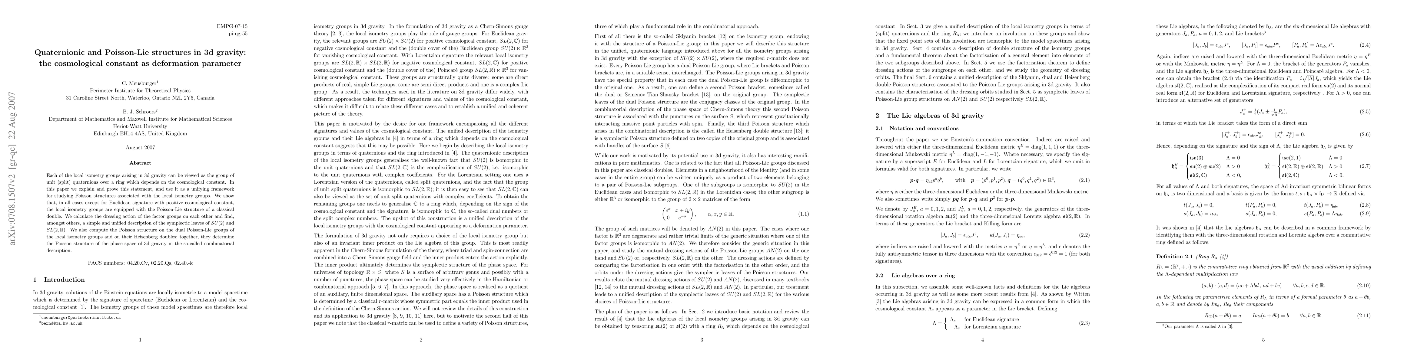 Each of the local isometry groups arising in 3d gravity can be viewed as the group of unit (split) quaternions over a ring which depends on the cosmological constant. In this paper we explain and prove this statement, and use it as a unifying framework for studying Poisson structures associated with the local isometry groups. We show that, in all cases except for Euclidean signature with positive cosmological constant, the local isometry groups are equipped with the Poisson-Lie structure of a classical double. We calculate the dressing action of the factor groups on each other and find, amongst others, a simple and unified description of the symplectic leaves of SU(2) and SL(2,R). We also compute the Poisson structure on the dual Poisson-Lie groups of the local isometry groups and on their Heisenberg doubles; together, they determine the Poisson structure of the phase space of 3d gravity in the so-called combinatorial description.