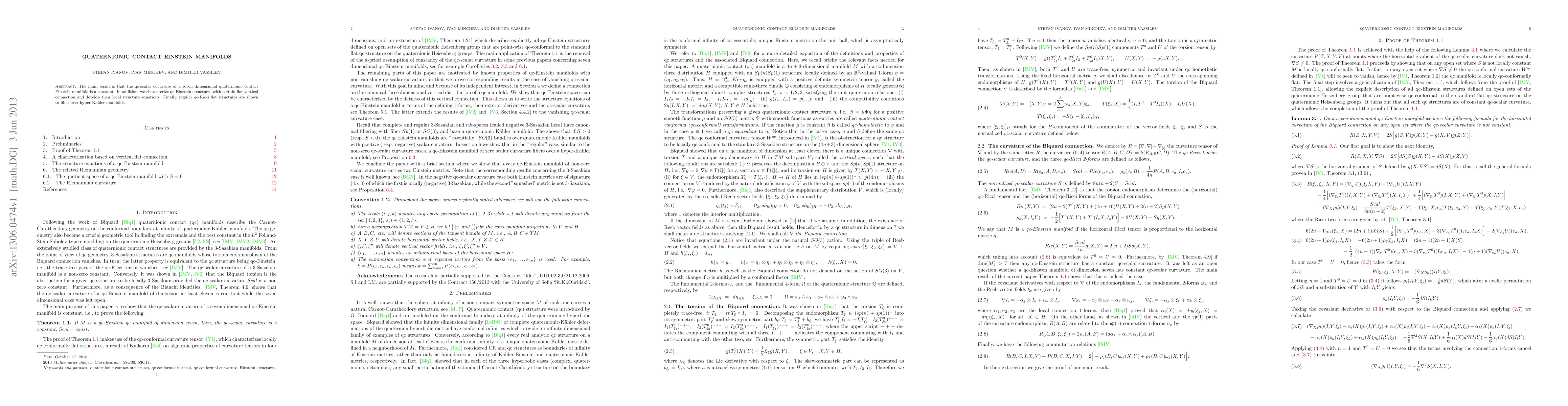 Summary: This paper demonstrates that the qc-scalar curvature of a seven-dimensional quaternionic contact Einstein manifold is constant. It also characterizes qc-Einstein structures with specific flat vertical connections and develops their local structure equations, and shows that regular qc-Ricci flat structures can be fibered over hyper-Kähler manifolds.