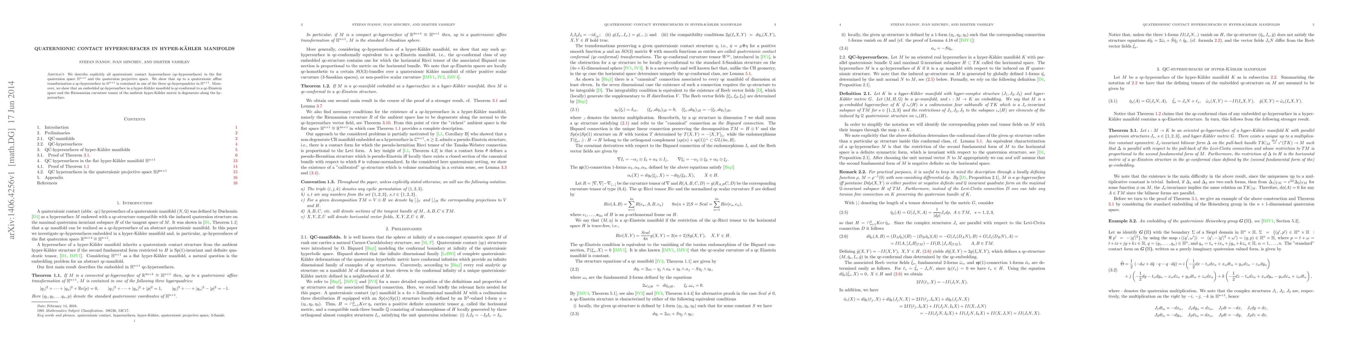 This paper identifies all quaternionic contact hypersurfaces in flat quaternion space and quaternion projective space, demonstrating that they are contained within specific qc-hyperquadrics. It also proves that embedded quaternionic contact hypersurfaces in hyper-Kähler manifolds are qc-conformal to qc-Einstein spaces, with the ambient hyper-Kähler metric's curvature tensor being degenerate along the hypersurface.
