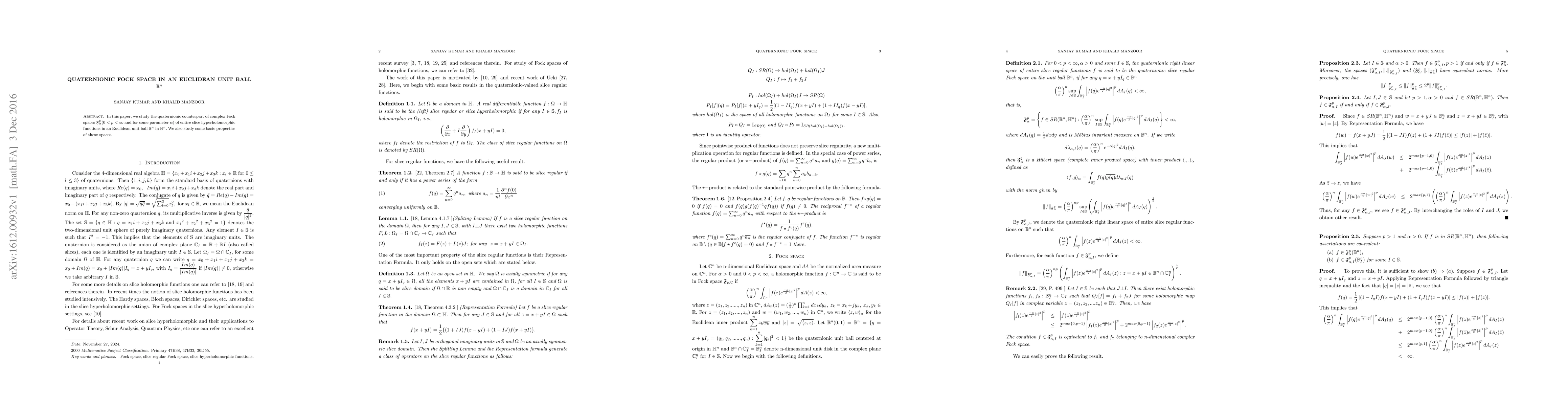The paper presents detailed propositions and theorems regarding the properties, norm equivalence, and reproducing kernels of quaternionic Fock spaces in an Euclidean unit ball.