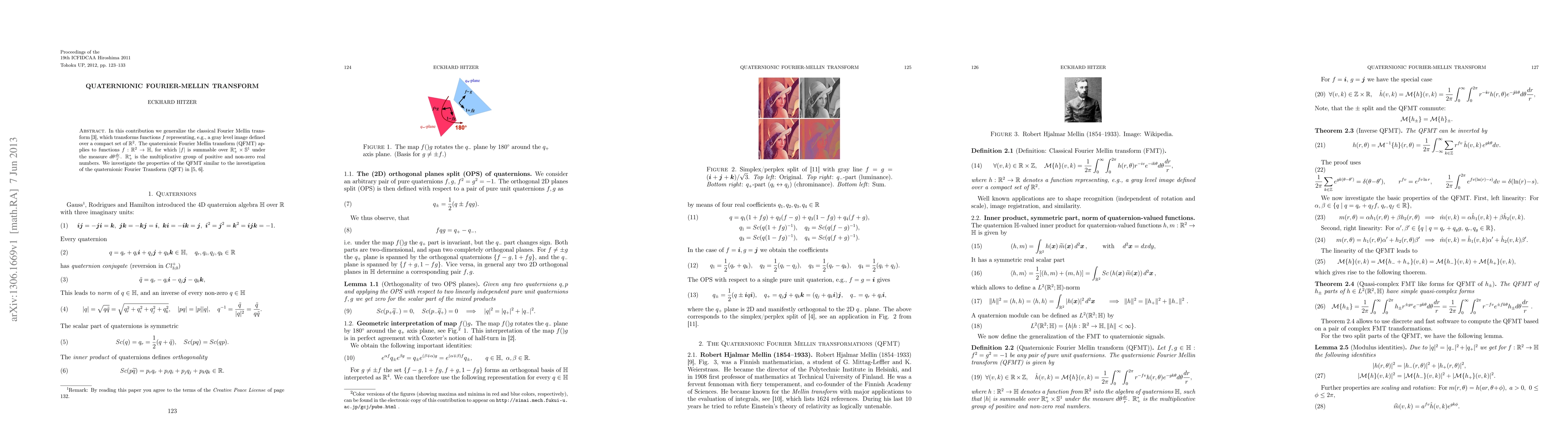 This paper generalizes the classical Fourier-Mellin transform to a quaternionic version, applicable to functions defined over $\mathbb{R}^2$ that map to quaternions. It explores properties of the quaternionic Fourier-Mellin transform analogous to those of the quaternionic Fourier transform.