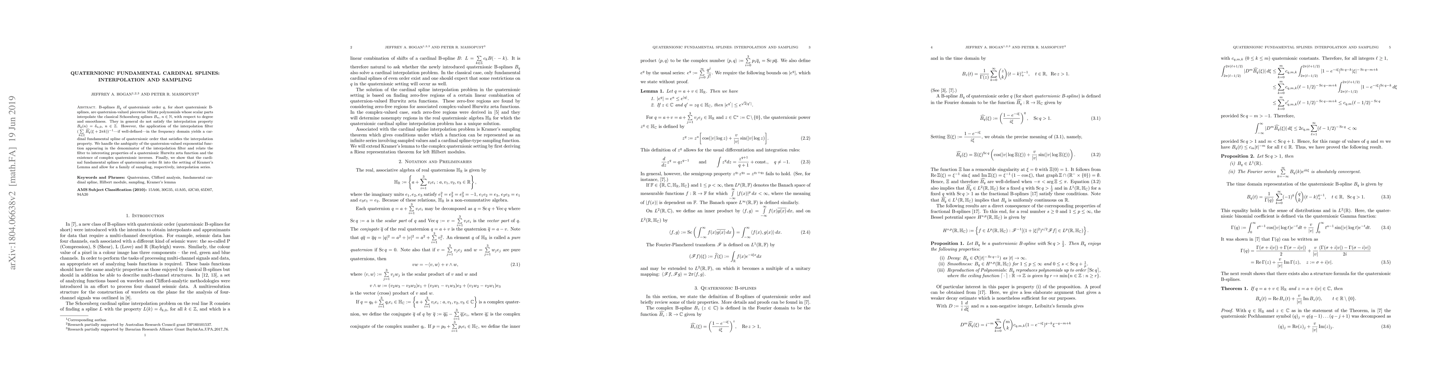 This paper introduces quaternionic fundamental cardinal splines, quaternion-valued piecewise polynomials that generalize classical Schoenberg splines. The authors address the interpolation properties of these splines and develop an interpolation filter that resolves their non-standard interpolation behavior, leveraging properties of quaternionic Hurwitz zeta functions and complex inverses.