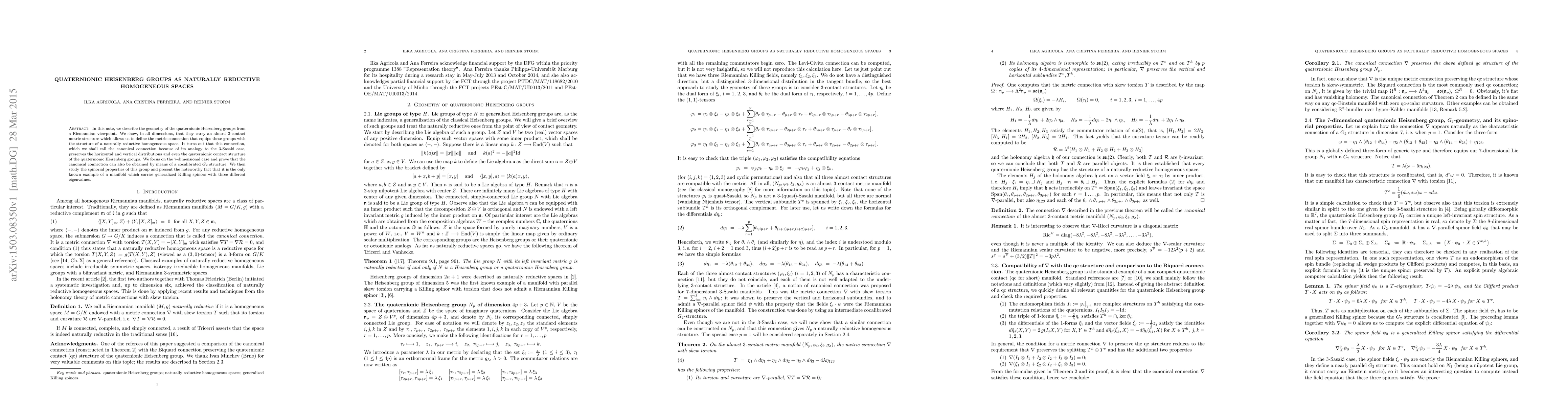 This paper explores the geometry of quaternionic Heisenberg groups, demonstrating they possess an almost $3$-contact metric structure, which defines a canonical connection making them naturally reductive homogeneous spaces. The $7$-dimensional case is highlighted, showing the canonical connection can also be derived from a cocalibrated $G_2$ structure, and it is the only known manifold with generalized Killing spinors having three distinct eigenvalues.