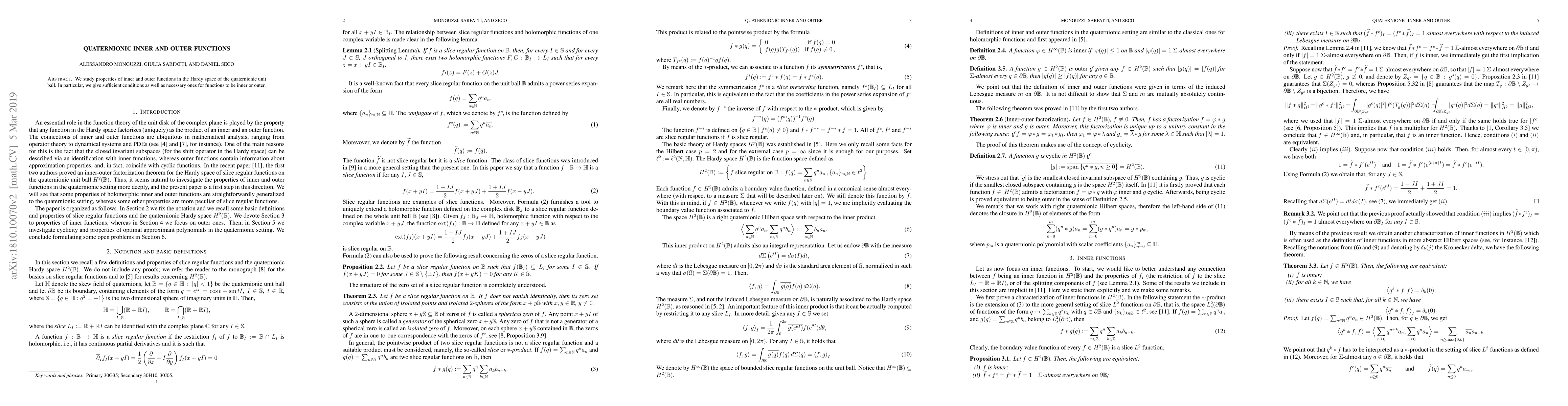 We study properties of inner and outer functions in the Hardy space of the quaternionic unit ball. In particular, we give sufficient conditions as well as necessary ones for functions to be inner or outer.