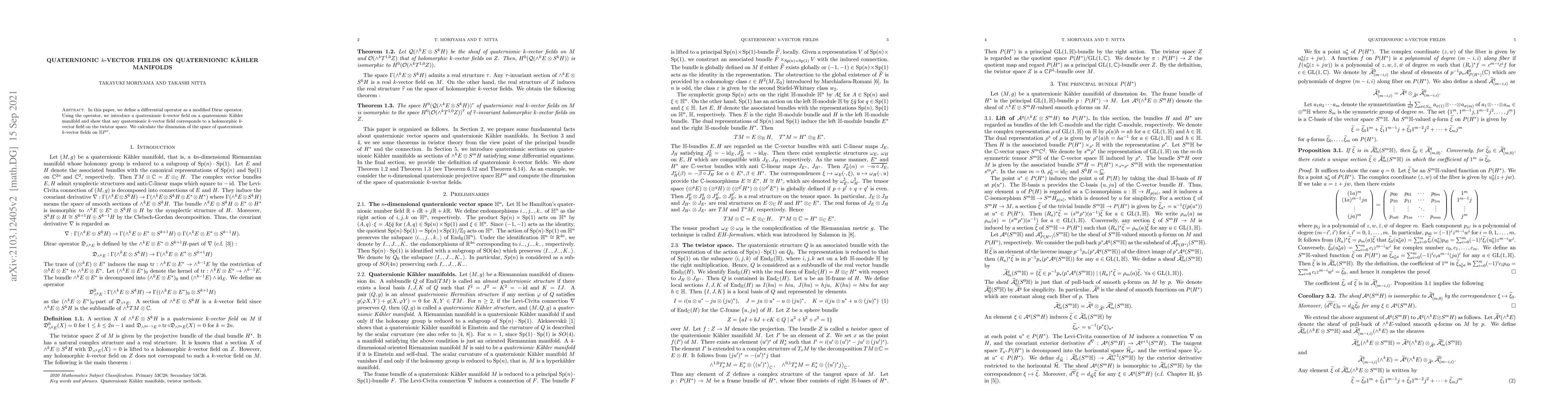 In this paper, we define a differential operator as a modified Dirac operator. Using the operator, we introduce a quaternionic $k$-vector field on a quaternionic K\"{a}hler manifold and show that any quaternionic $k$-vector field corresponds to a holomorphic $k$-vector field on the twistor space. We calculate the dimension of the space of quaternionic $k$-vector fields on $\mathbb{H}P^n$.