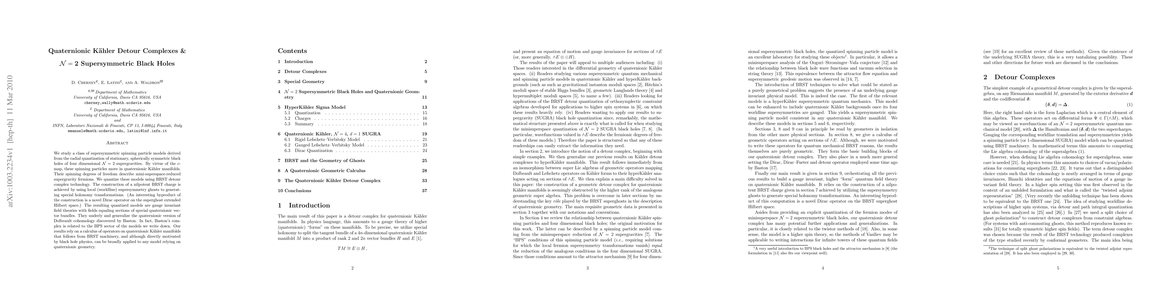 This paper explores supersymmetric spinning particle models derived from four-dimensional N=2 supergravity, focusing on black holes, and utilizes BRST complex technology for quantization. The models reveal novel Dirac operators and generalize quaternionic geometry applications, linking to Baston's quaternionic Dolbeault cohomology.