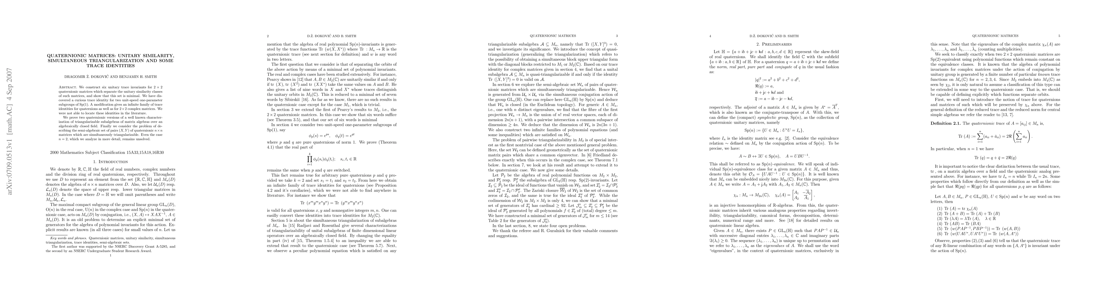 This paper constructs six unitary trace invariants for 2x2 quaternionic matrices that uniquely identify their similarity classes and proves quaternionic versions of triangularizability characterizations. It also explores the semi-algebraic set of quaternionic matrix pairs that are simultaneously triangularizable.