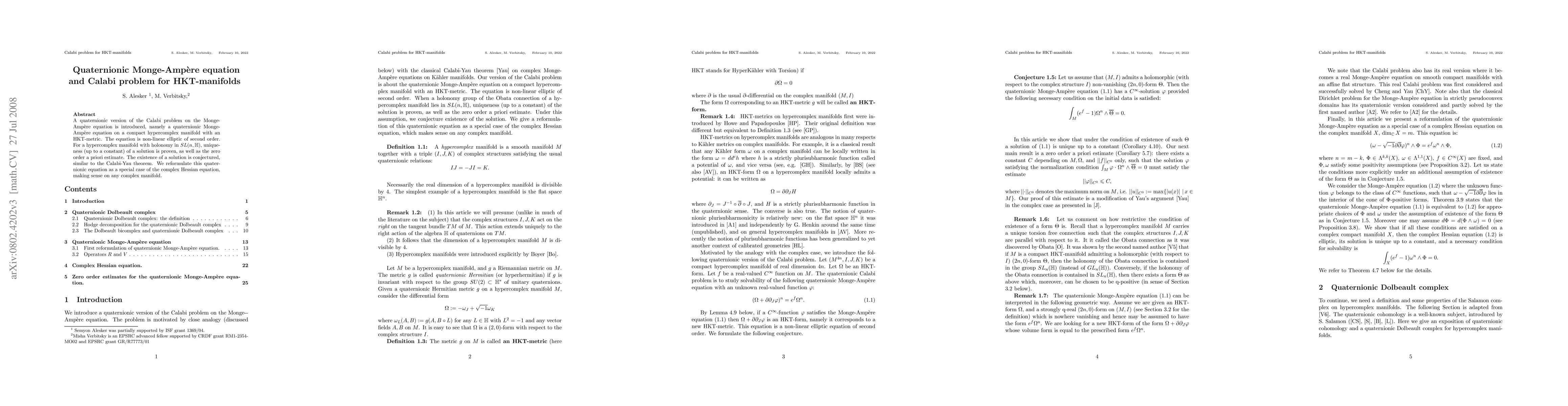 This paper introduces a quaternionic version of the Calabi problem, focusing on a non-linear elliptic Monge-Ampere equation on HKT-manifolds, proving uniqueness and zero-order a priori estimates for solutions, while conjecturing the existence of solutions akin to the Calabi-Yau theorem. The equation is also reformulated as a complex Hessian equation applicable to any complex manifold.