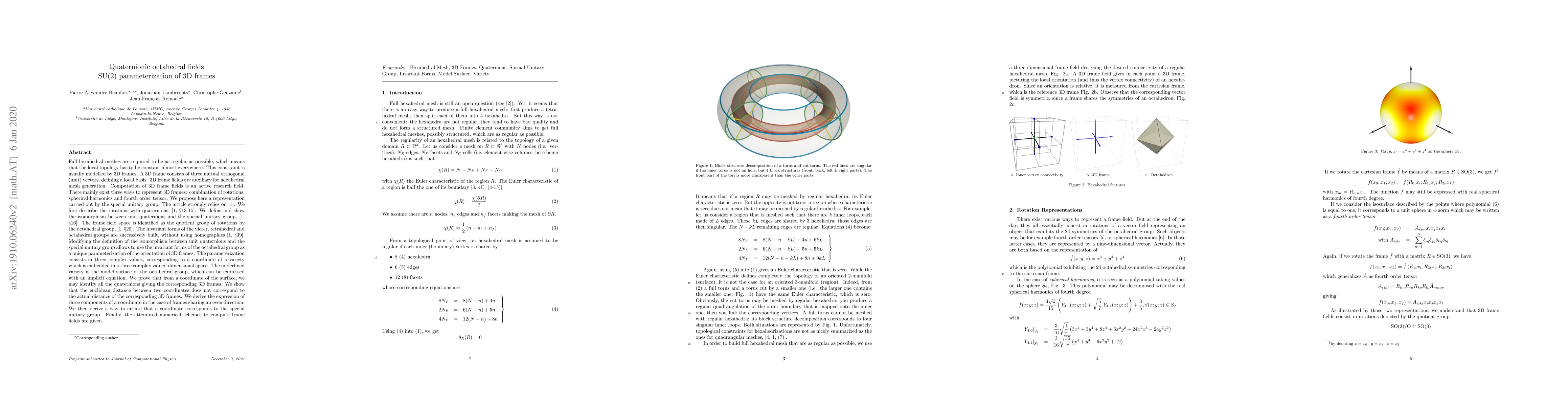3D frame fields are auxiliary for hexahedral mesh generation. There mainly exist three ways to represent 3D frames: combination of rotations, spherical harmonics and fourth order tensor. We propose here a representation carried out by the special unitary group. The article strongly relies on \cite{du1964homographies}. We first describe the rotations with quaternions, \cite[\S 13-15]{du1964homographies}. We define and show the isomorphism between unit quaternions and the special unitary group, \cite[\S 16]{du1964homographies}. The frame field space is identified as the quotient group of rotations by the octahedral group, \cite[\S 20]{du1964homographies}. The invariant forms of the vierer, tetrahedral and octahedral groups are successively built, without using homographies \cite[\S 39]{du1964homographies}. Modifying the definition of the isomorphism between unit quaternions and the special unitary group allows to use the invariant forms of the octahedral group as a unique parameterization of the orientation of 3D frames. The parameterization consists in three complex values, corresponding to a coordinate of a variety which is embedded in a three complex valued dimensional space. The underlined variety is the model surface of the octahedral group, which can be expressed with an implicit equation. We prove that from a coordinate of the surface, we may identify all the quaternions giving the corresponding 3D frames. We show that the euclidean distance between two coordinates does not correspond to the actual distance of the corresponding 3D frames. We derive the expression of three components of a coordinate in the case of frames sharing an even direction. We then derive a way to ensure that a coordinate corresponds to the special unitary group. Finally, the attempted numerical schemes to compute frame fields are given.