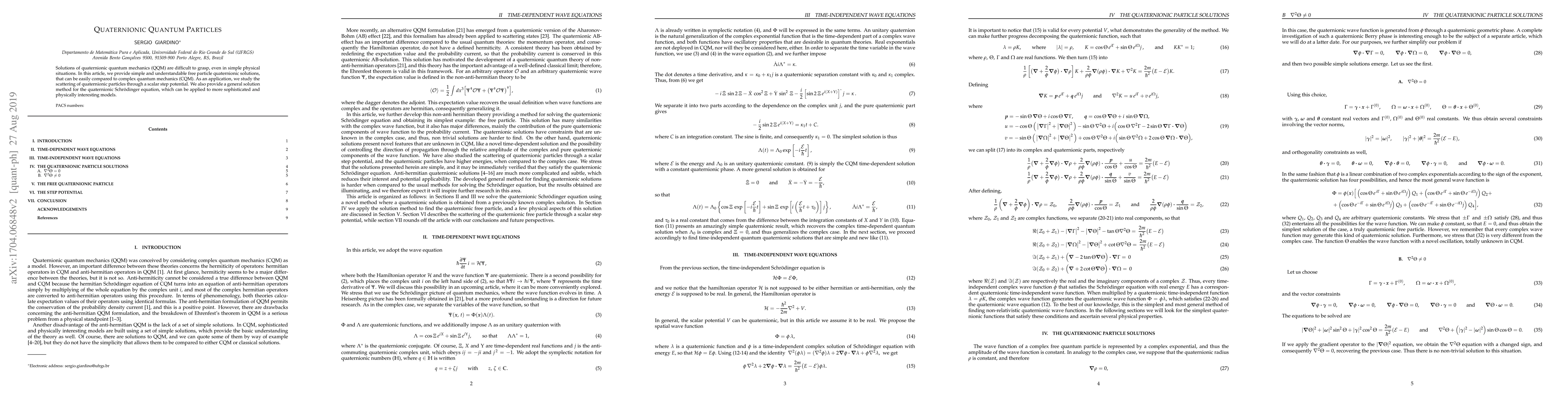 This paper presents comprehensible quaternionic quantum mechanics solutions for free particles, facilitating comparison with complex quantum mechanics. It also explores quaternionic particle scattering through a scalar step potential and introduces a general solution method for the quaternionic Schrödinger equation applicable to more complex models.