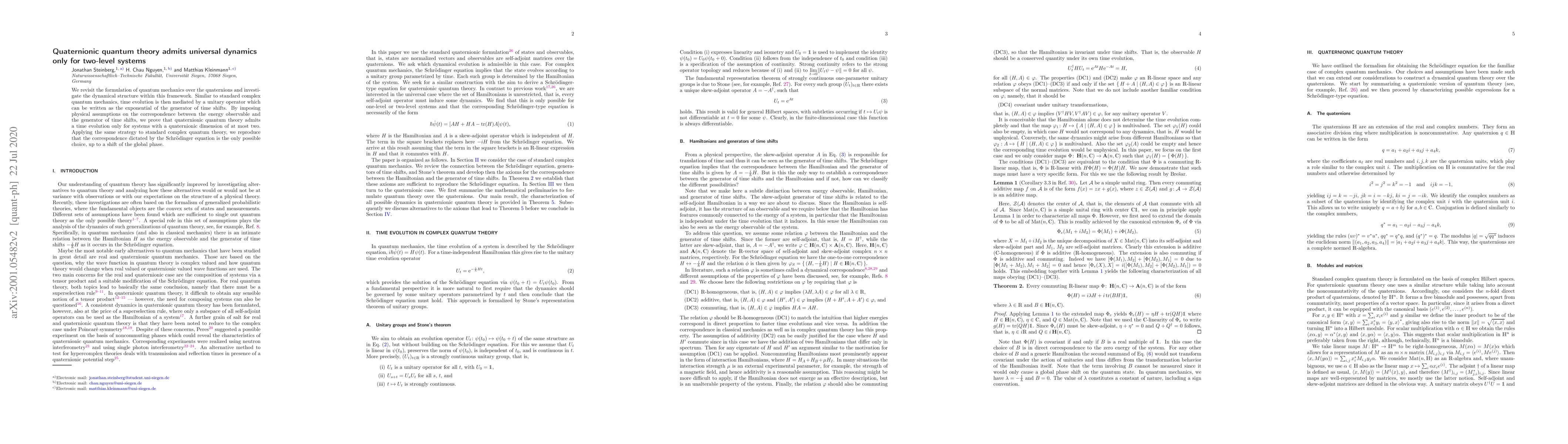 We revisit the formulation of quantum mechanics over the quaternions and investigate the dynamical structure within this framework. Similar to standard complex quantum mechanics, time evolution is then mediated by a unitary operator which can be written as the exponential of the generator of time shifts. By imposing physical assumptions on the correspondence between the energy observable and the generator of time shifts, we prove that quaternionic quantum theory admits a time evolution only for systems with a quaternionic dimension of at most two. Applying the same strategy to standard complex quantum theory, we reproduce that the correspondence dictated by the Schr\"odinger equation is the only possible choice, up to a shift of the global phase.