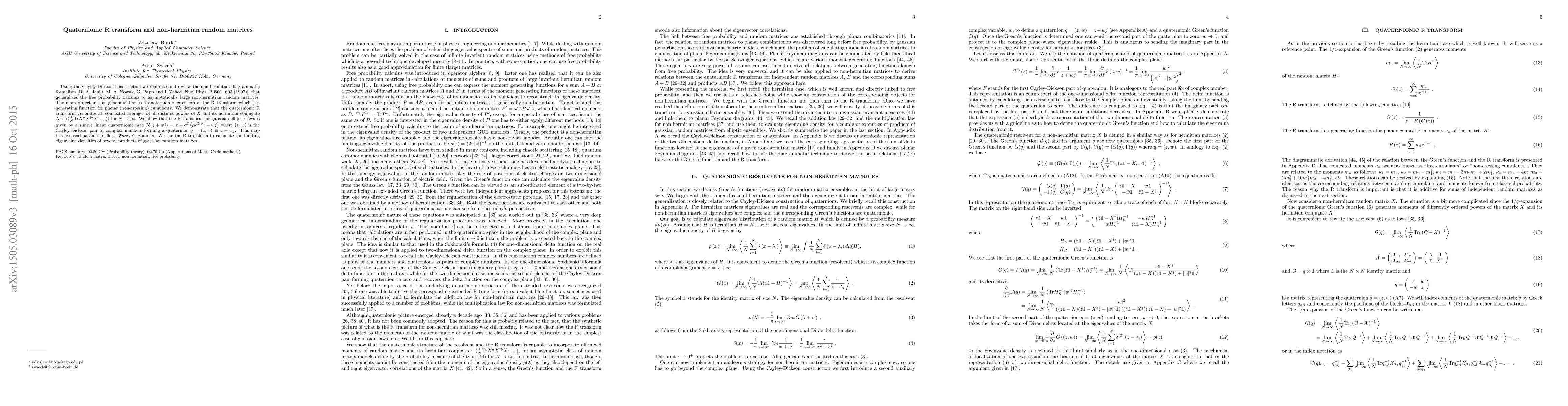 Using the Cayley-Dickson construction we rephrase and review the non-hermitian diagrammatic formalism [R. A. Janik, M. A. Nowak, G. Papp and I. Zahed, Nucl.Phys. B $\textbf{501}$, 603 (1997)], that generalizes the free probability calculus to asymptotically large non-hermitian random matrices. The main object in this generalization is a quaternionic extension of the R transform which is a generating function for planar (non-crossing) cumulants. We demonstrate that the quaternionic R transform generates all connected averages of all distinct powers of $X$ and its hermitian conjugate $X^\dagger$: $\langle\langle \frac{1}{N} \mbox{Tr} X^{a} X^{\dagger b} X^c \ldots \rangle\rangle$ for $N\rightarrow \infty$. We show that the R transform for gaussian elliptic laws is given by a simple linear quaternionic map $\mathcal{R}(z+wj) = x + \sigma^2 \left(\mu e^{2i\phi} z + w j\right)$ where $(z,w)$ is the Cayley-Dickson pair of complex numbers forming a quaternion $q=(z,w)\equiv z+ wj$. This map has five real parameters $\Re e x$, $\Im m x$, $\phi$, $\sigma$ and $\mu$. We use the R transform to calculate the limiting eigenvalue densities of several products of gaussian random matrices.
