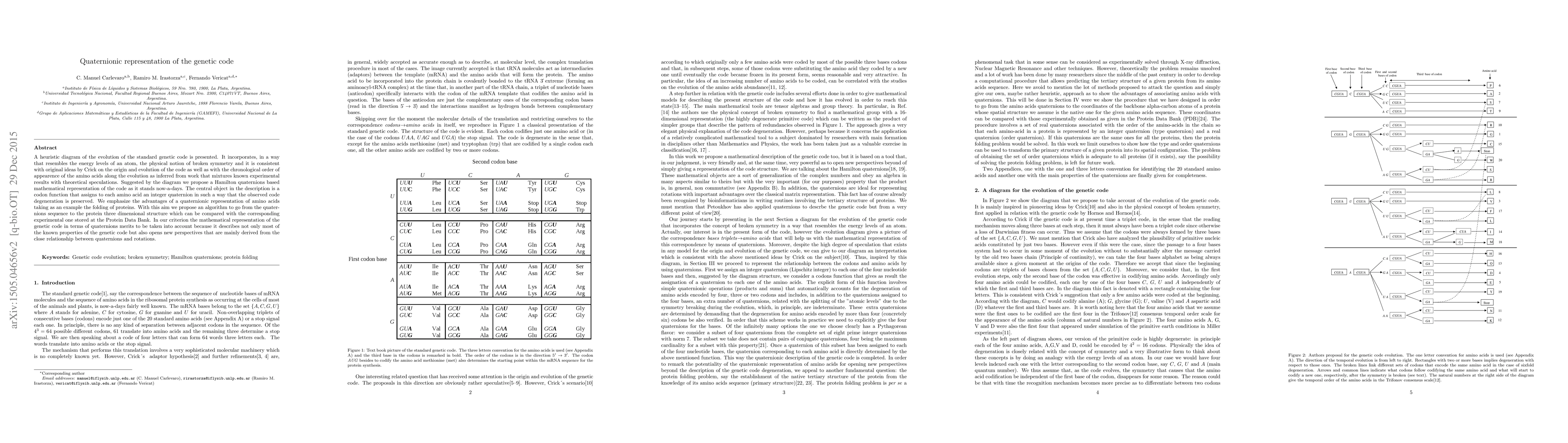 A heuristic diagram of the evolution of the standard genetic code is presented. It incorporates, in a way that resembles the energy levels of an atom, the physical notion of broken symmetry and it is consistent with original ideas by Crick on the origin and evolution of the code as well as with the chronological order of appearence of the amino acids along the evolution as inferred from work that mixtures known experimental results with theoretical speculations. Suggested by the diagram we propose a Hamilton quaternions based mathematical representation of the code as it stands now-a-days. The central object in the description is a codon function that assigns to each amino acid an integer quaternion in such a way that the observed code degeneration is preserved. We emphasize the advantages of a quaternionic representation of amino acids taking as an example the folding of proteins. With this aim we propose an algorithm to go from the quaternions sequence to the protein three dimensional structure which can be compared with the corresponding experimental one stored at the Protein Data Bank. In our criterion the mathematical representation of the genetic code in terms of quaternions merits to be taken into account because it describes not only most of the known properties of the genetic code but also opens new perspectives that are mainly derived from the close relationship between quaternions and rotations.