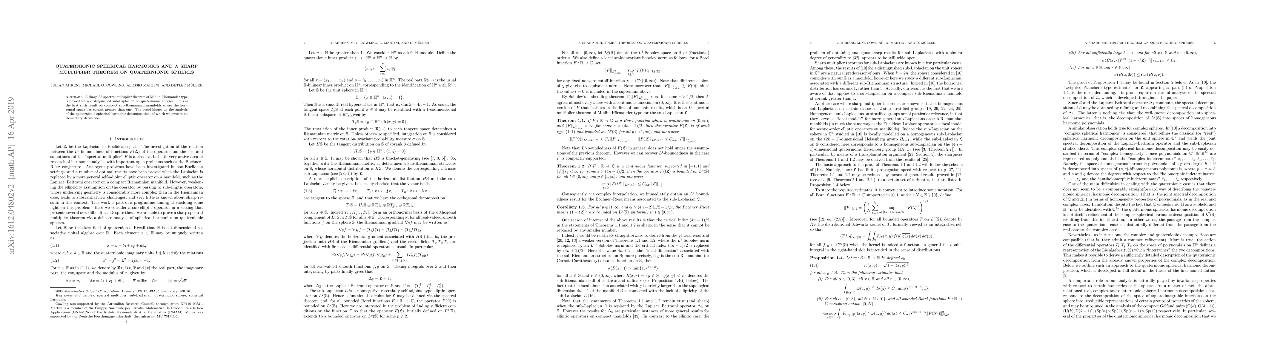 A sharp $L^p$ spectral multiplier theorem of Mihlin--H\"ormander type is proved for a distinguished sub-Laplacian on quaternionic spheres. This is the first such result on compact sub-Riemannian manifolds where the horizontal space has corank greater than one. The proof hinges on the analysis of the quaternionic spherical harmonic decomposition, of which we present an elementary derivation.