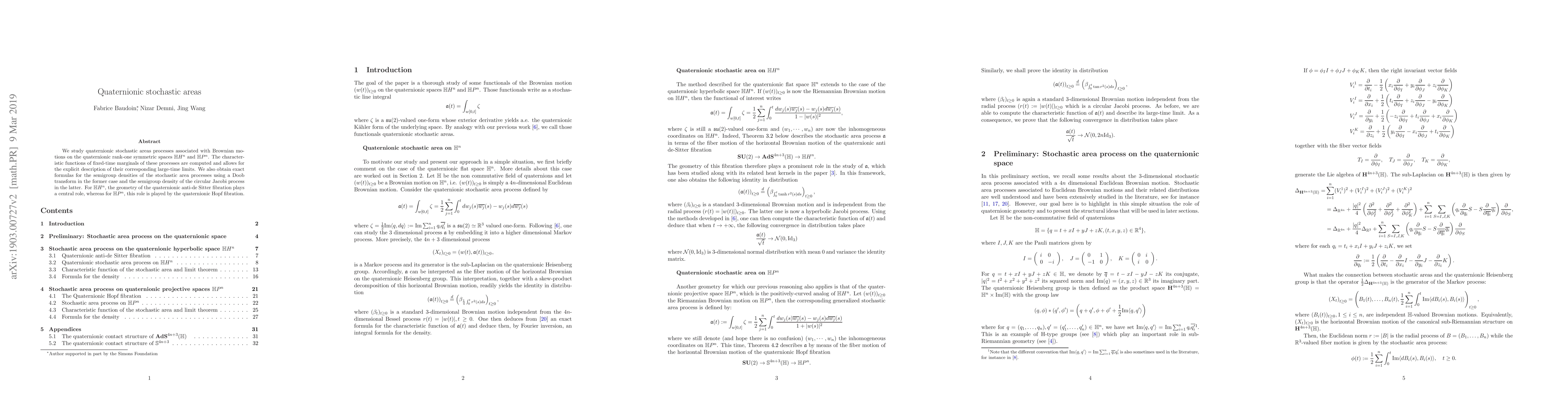 This research paper studies quaternionic stochastic areas processes associated with Brownian motions on specific geometric spaces, computing their characteristic functions and semigroup densities to describe large-time limits.