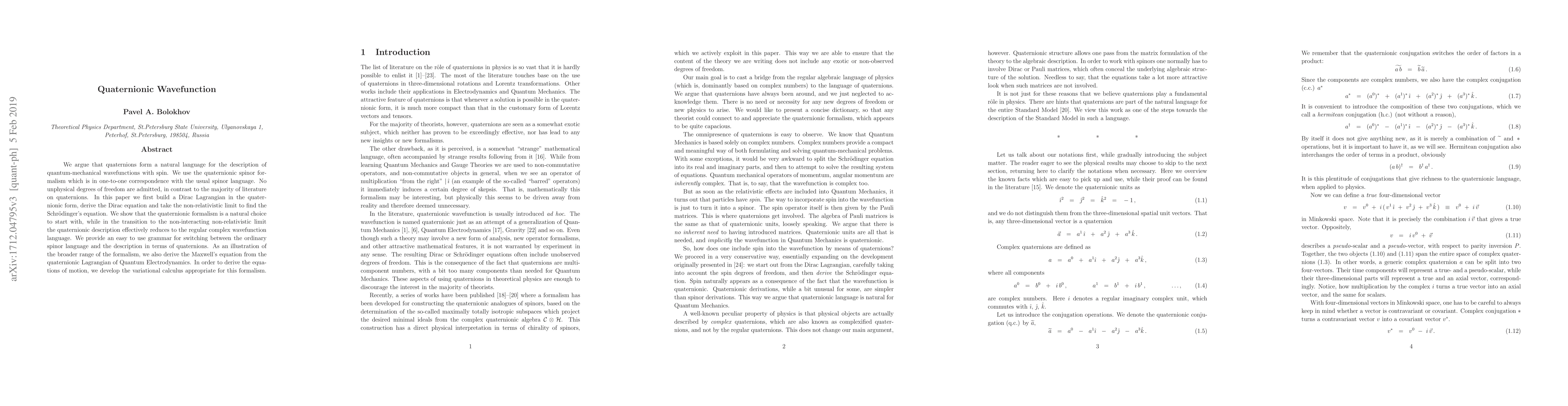 We argue that quaternions form a natural language for the description of quantum-mechanical wavefunctions with spin. We use the quaternionic spinor formalism which is in one-to-one correspondence with the usual spinor language. No unphysical degrees of freedom are admitted, in contrast to the majority of literature on quaternions. In this paper we first build a Dirac Lagrangian in the quaternionic form, derive the Dirac equation and take the non-relativistic limit to find the Schr\"odinger's equation. We show that the quaternionic formalism is a natural choice to start with, while in the transition to the non-interacting non-relativistic limit the quaternionic description effectively reduces to the regular complex wavefunction language. We provide an easy to use grammar for switching between the ordinary spinor language and the description in terms of quaternions. As an illustration of the broader range of the formalism, we also derive the Maxwell's equation from the quaternionic Lagrangian of Quantum Electrodynamics. In order to derive the equations of motion, we develop the variational calculus appropriate for this formalism.