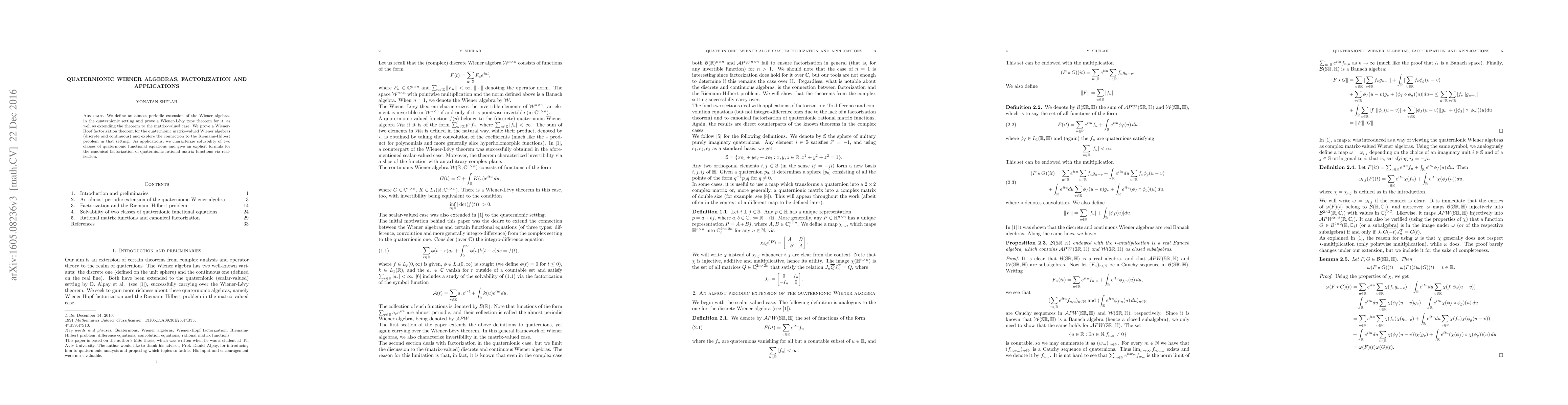We define an almost periodic extension of the Wiener algebras in the quaternionic setting and prove a Wiener-Levy type theorem for it, as well as extending the theorem to the matrix-valued case. We prove a Wiener-Hopf factorization theorem for the quaternionic matrix-valued Wiener algebras (discrete and continuous) and explore the connection to the Riemann-Hilbert problem in that setting. As applications, we characterize solvability of two classes of quaternionic functional equations and give an explicit formula for the canonical factorization of quaternionic rational matrix functions via realization.