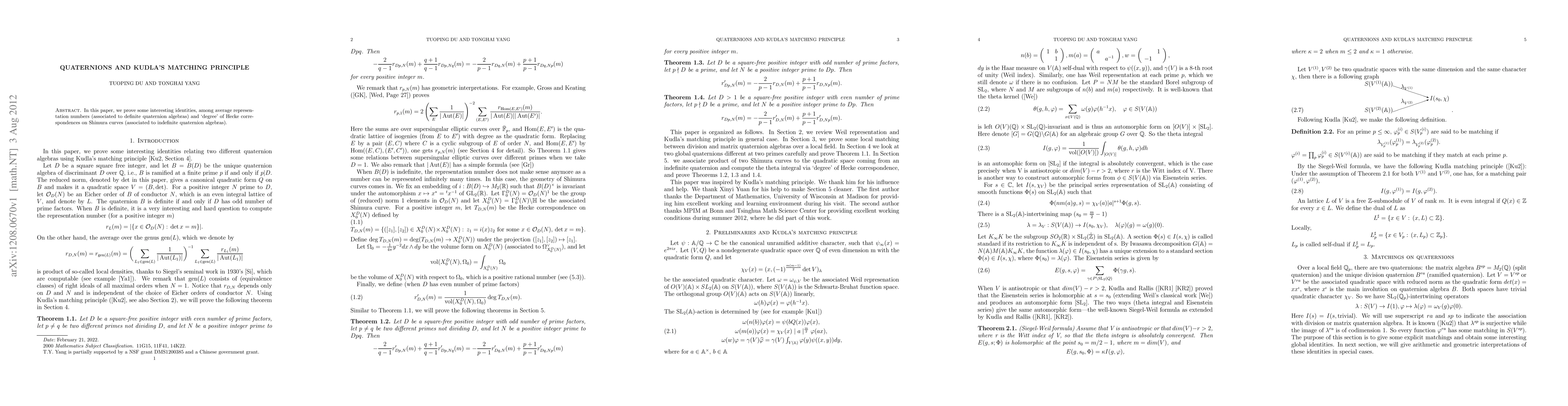 In this paper, we prove some interesting identities, among average representation numbers (associated to definite quaternion algebras) and `degree' of Hecke correspondences on Shimura curves (associated to indefinite quaternion algebras).