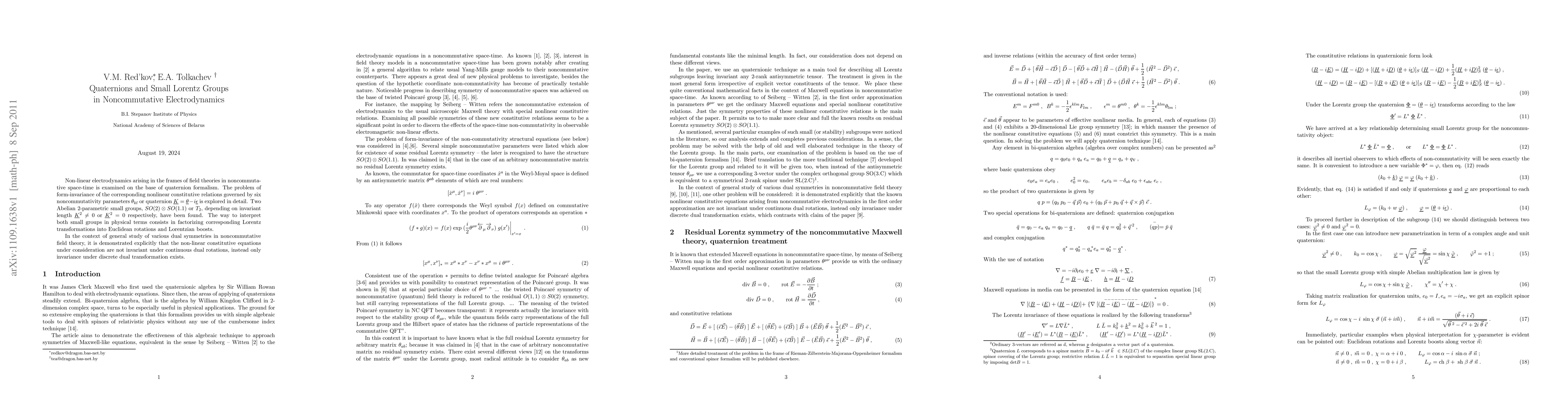 This paper explores non-linear electrodynamics in noncommutative space-time using quaternion formalism, identifying two Abelian 2-parametric small groups, SO(2) ⊗ O(1.1) or T₂, which factorize Lorentz transformations into Euclidean rotations and Lorentzian boosts. It concludes that the nonlinear constitutive equations exhibit invariance under discrete dual transformations but not under continuous dual rotations.