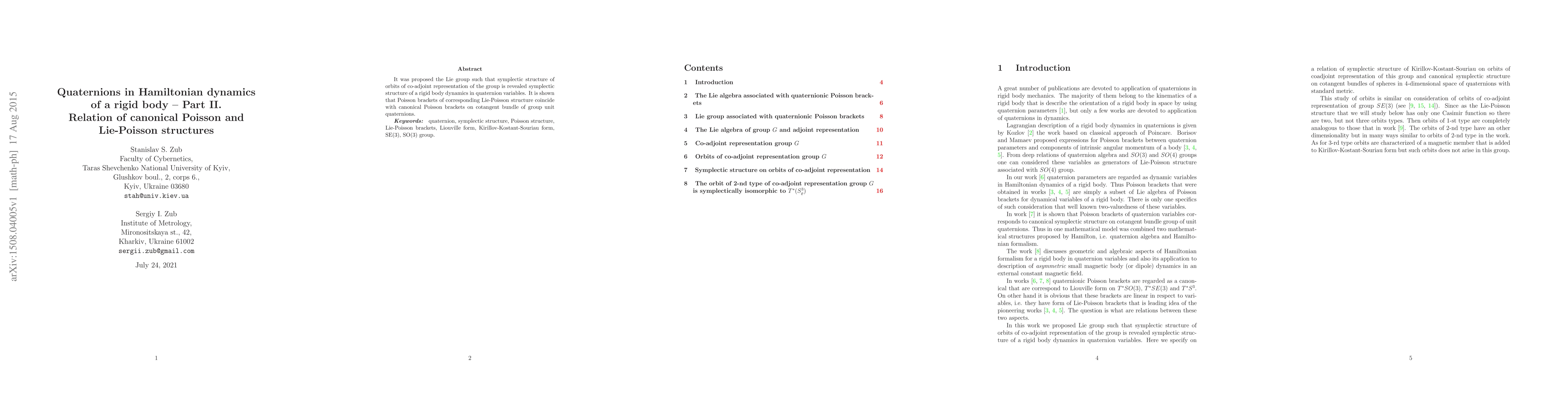 It was proposed the Lie group such that symplectic structure of orbits of co-adjoint representation of the group is revealed symplectic structure of a rigid body dynamics in quaternion variables. It is shown that Poisson brackets of corresponding Lie-Poisson structure coincide with canonical Poisson brackets on cotangent bundle of group unit quaternions.