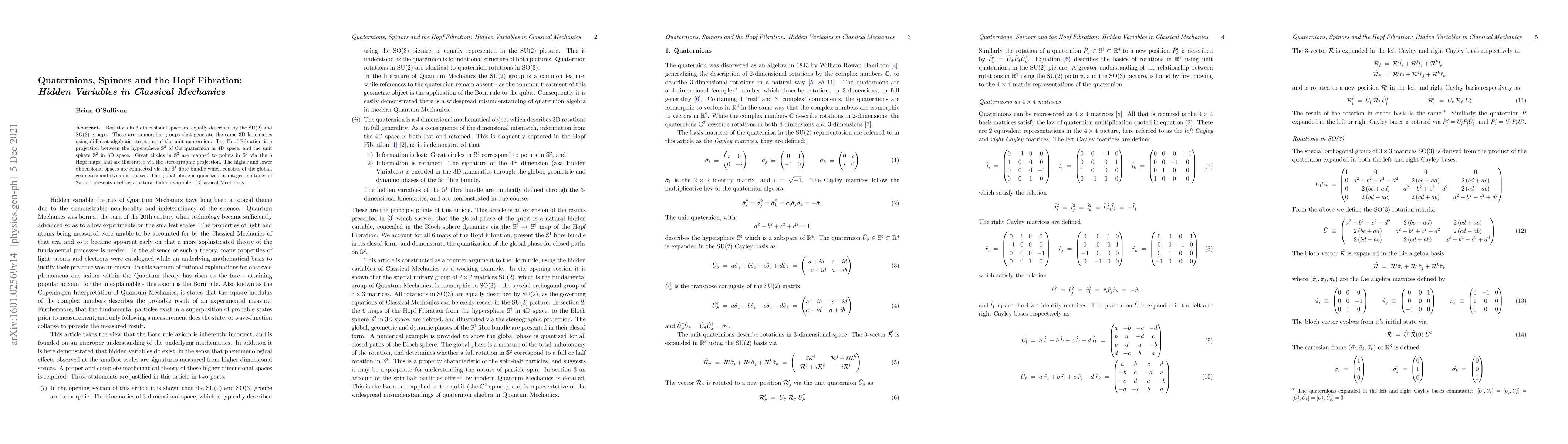 Rotations in 3 dimensional space are equally described by the SU(2) and SO(3) groups. These isomorphic groups generate the same 3D kinematics using different algebraic structures of the unit quaternion. The Hopf Fibration is a projection between the hypersphere $\mathbb{S}^3$ of the quaternion in 4D space, and the unit sphere $\mathbb{S}^2$ in 3D space. Great circles in $\mathbb{S}^3$ are mapped to points in $\mathbb{S}^2$ via the 6 Hopf maps, and are illustrated via the stereographic projection. The higher and lower dimensional spaces are connected via the $\mathbb{S}^1$ fibre bundle which consists of the global, geometric and dynamic phases. The global phase is quantized in integer multiples of $2\pi$ and presents itself as a natural hidden variable of Classical Mechanics.