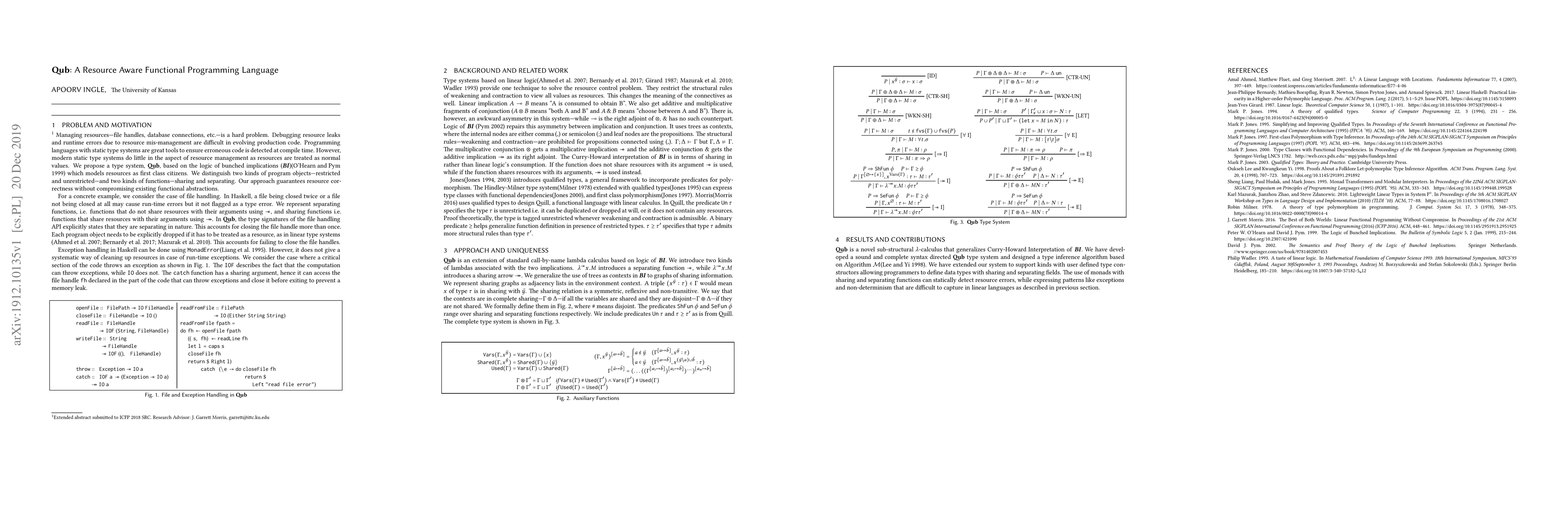 QuB is a functional programming language that models resources as first-class citizens using a type system based on bunched implications. It distinguishes between restricted and unrestricted program objects and sharing and separating functions to ensure resource correctness without compromising functional abstractions.