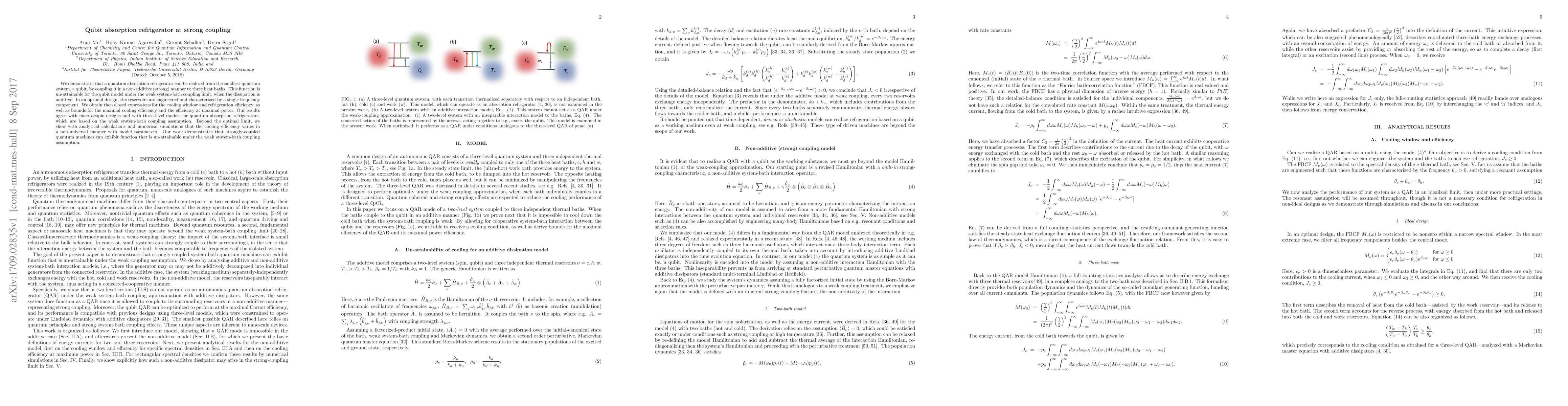 We demonstrate that a quantum absorption refrigerator can be realized from the smallest quantum system, a qubit, by coupling it in a non-additive (strong) manner to three heat baths. This function is un-attainable for the qubit model under the weak system-bath coupling limit, when the dissipation is additive. In an optimal design, the reservoirs are engineered and characterized by a single frequency component. We obtain then closed expressions for the cooling window and refrigeration efficiency, as well as bounds for the maximal cooling efficiency and the efficiency at maximal power. Our results agree with macroscopic designs and with three-level models for quantum absorption refrigerators, which are based on the weak system-bath coupling assumption. Beyond the optimal limit, we show with analytic calculations and numerical simulations that the cooling efficiency varies in a non-universal manner with model parameters. Our work demonstrates that strongly-coupled quantum machines can exhibit function that is un-attainable under the weak system-bath coupling assumption.