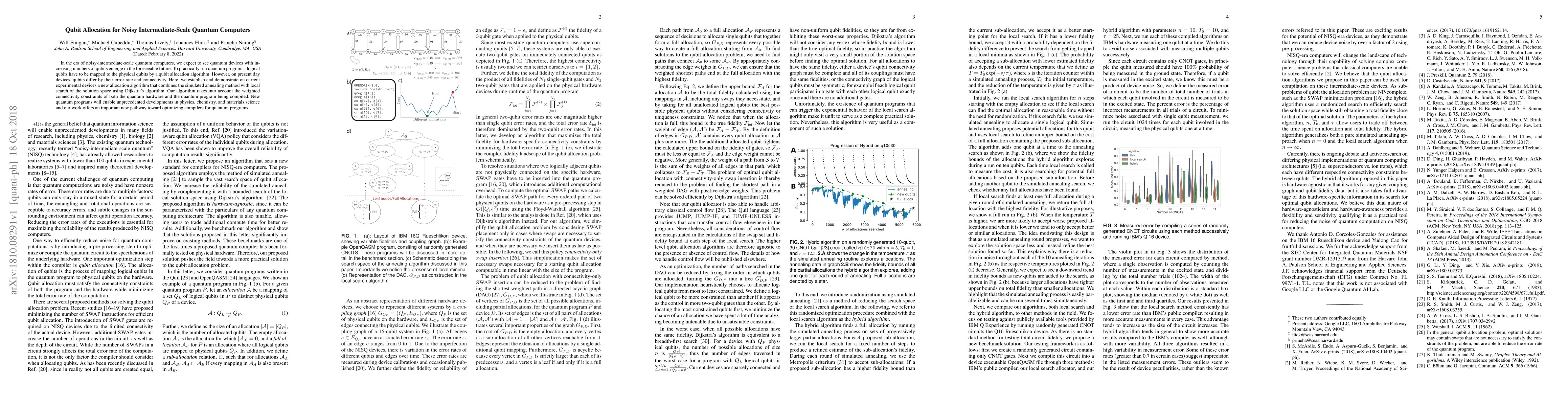 In the era of noisy-intermediate-scale quantum computers, we expect to see quantum devices with increasing numbers of qubits emerge in the foreseeable future. To practically run quantum programs, logical qubits have to be mapped to the physical qubits by a qubit allocation algorithm. However, on present day devices, qubits differ by their error rate and connectivity. Here, we establish and demonstrate on current experimental devices a new allocation algorithm that combines the simulated annealing method with local search of the solution space using Dijkstra's algorithm. Our algorithm takes into account the weighted connectivity constraints of both the quantum hardware and the quantum program being compiled. New quantum programs will enable unprecedented developments in physics, chemistry, and materials science and our work offers an important new pathway toward optimizing compilers for quantum programs.