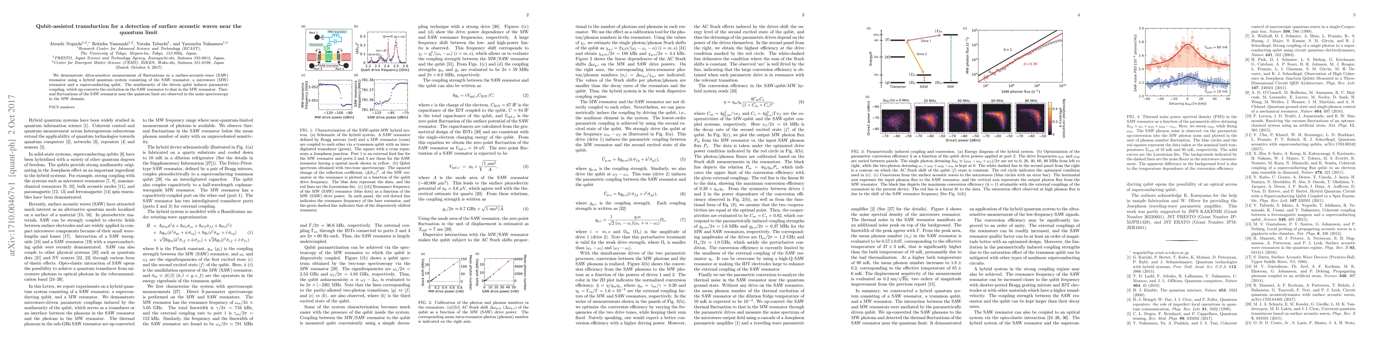 We demonstrate ultra-sensitive measurement of fluctuations in a surface-acoustic-wave~(SAW) resonator using a hybrid quantum system consisting of the SAW resonator, a microwave (MW) resonator and a superconducting qubit. The nonlinearity of the driven qubit induces parametric coupling, which up-converts the excitation in the SAW resonator to that in the MW resonator. Thermal fluctuations of the SAW resonator near the quantum limit are observed in the noise spectroscopy in the MW domain.