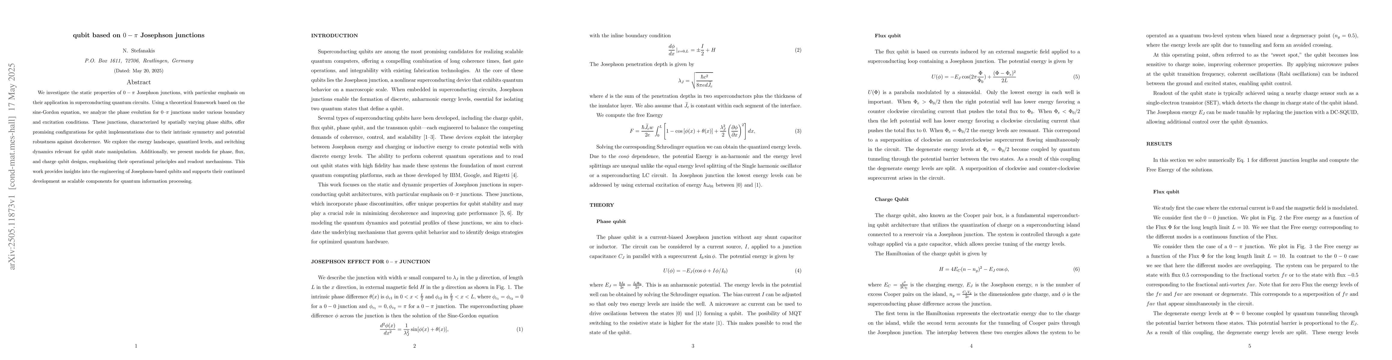 The paper presents models for phase, flux, and charge qubit designs based on 0-$\pi$ Josephson junctions, detailing their operational principles and readout mechanisms.