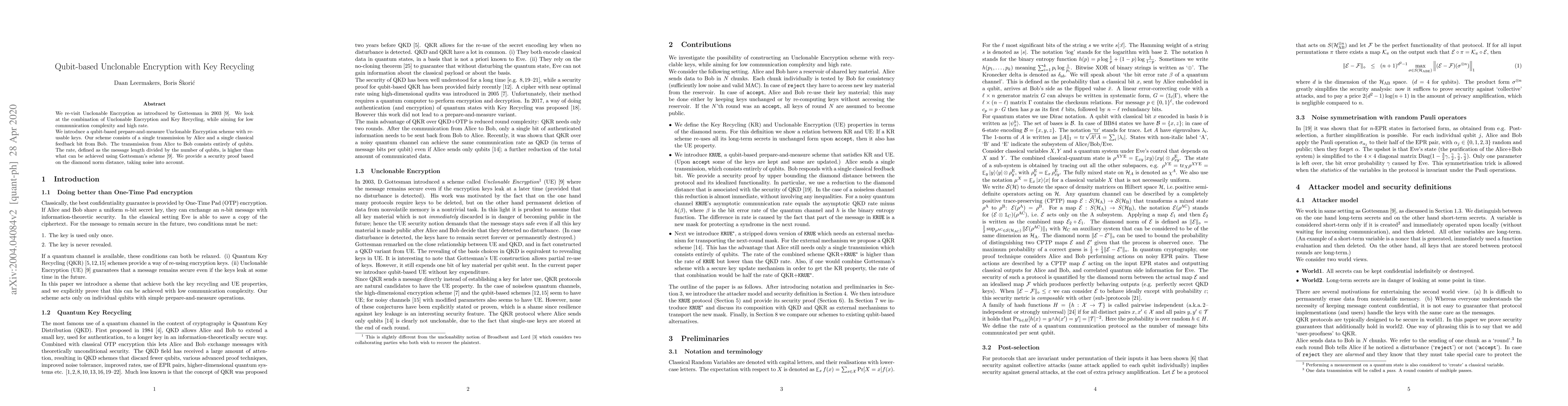 We re-visit Unclonable Encryption as introduced by Gottesman in 2003. We look at the combination of Unclonable Encryption and Key Recycling, while aiming for low communication complexity and high rate. We introduce a qubit-based prepare-and-measure Unclonable Encryption scheme with re-usable keys. Our scheme consists of a single transmission by Alice and a single classical feedback bit from Bob. The transmission from Alice to Bob consists entirely of qubits. The rate, defined as the message length divided by the number of qubits, is higher than what can be achieved using Gottesman's scheme. We provide a security proof based on the diamond norm distance, taking noise into account.