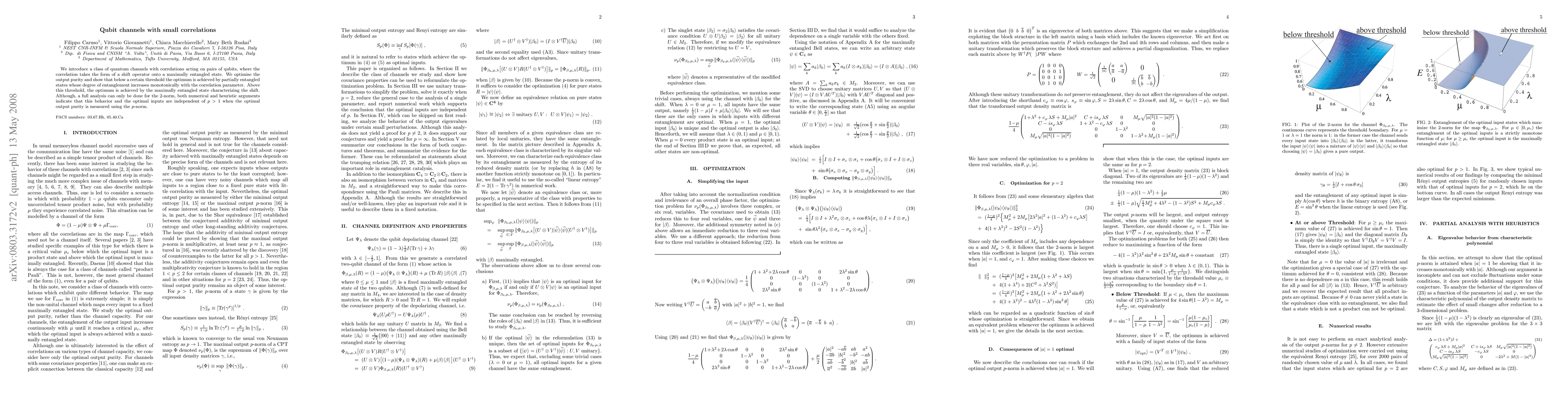 We introduce a class of quantum channels with correlations acting on pairs of qubits, where the correlation takes the form of a shift operator onto a maximally entangled state. We optimise the output purity and show that below a certain threshold the optimum is achieved by partially entangled states whose degree of entanglement increases monotonically with the correlation parameter. Above this threshold, the optimum is achieved by the maximally entangled state characterizing the shift. Although, a full analysis can only be done for the 2-norm, both numerical and heuristic arguments indicate that this behavior and the optimal inputs are independent of p>1 when the optimal output purity is measured using the p-norm.