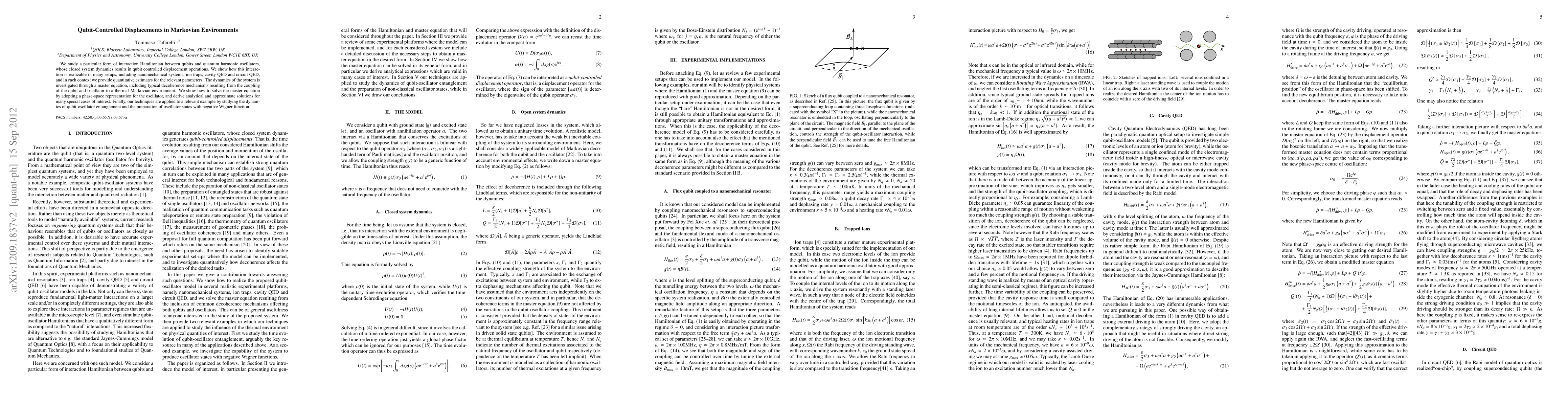 This paper investigates qubit-controlled displacement operations via interaction Hamiltonians between qubits and quantum harmonic oscillators, demonstrating their realizability in various physical systems. It employs a master equation to analyze the dynamics, including decoherence effects, and provides analytical solutions for special cases, ultimately applying the techniques to study qubit-oscillator entanglement and preparation of states with negative Wigner functions.