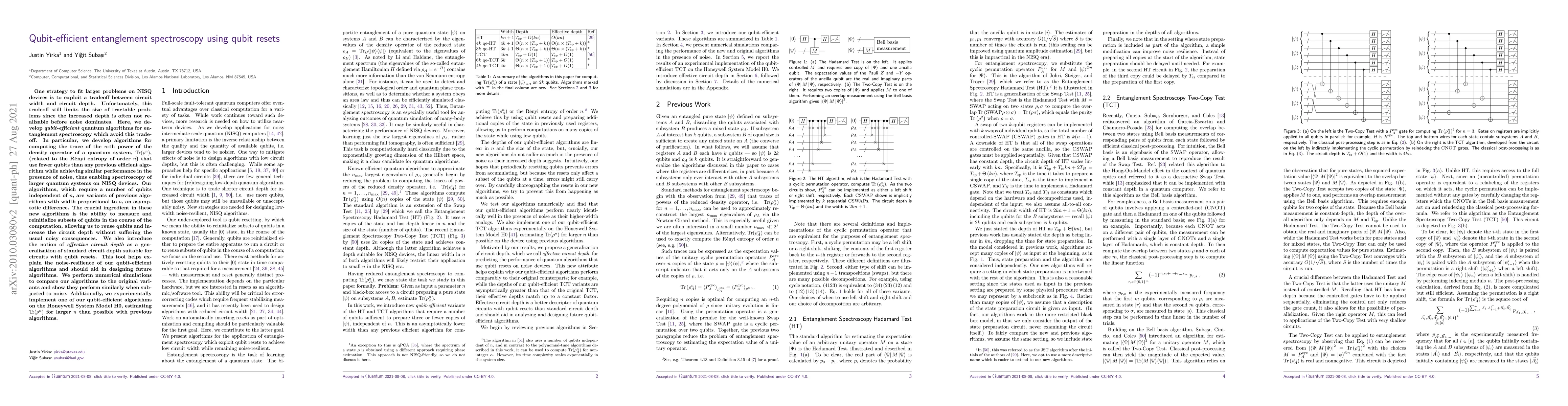 One strategy to fit larger problems on NISQ devices is to exploit a tradeoff between circuit width and circuit depth. Unfortunately, this tradeoff still limits the size of tractable problems since the increased depth is often not realizable before noise dominates. Here, we develop qubit-efficient quantum algorithms for entanglement spectroscopy which avoid this tradeoff. In particular, we develop algorithms for computing the trace of the n-th power of the density operator of a quantum system, $Tr(\rho^n)$, (related to the R\'enyi entropy of order n) that use fewer qubits than any previous efficient algorithm while achieving similar performance in the presence of noise, thus enabling spectroscopy of larger quantum systems on NISQ devices. Our algorithms, which require a number of qubits independent of n, are variants of previous algorithms with width proportional to n, an asymptotic difference. The crucial ingredient in these new algorithms is the ability to measure and reinitialize subsets of qubits in the course of the computation, allowing us to reuse qubits and increase the circuit depth without suffering the usual noisy consequences. We also introduce the notion of effective circuit depth as a generalization of standard circuit depth suitable for circuits with qubit resets. This tool helps explain the noise-resilience of our qubit-efficient algorithms and should aid in designing future algorithms. We perform numerical simulations to compare our algorithms to the original variants and show they perform similarly when subjected to noise. Additionally, we experimentally implement one of our qubit-efficient algorithms on the Honeywell System Model H0, estimating $Tr(\rho^n)$ for larger n than possible with previous algorithms.