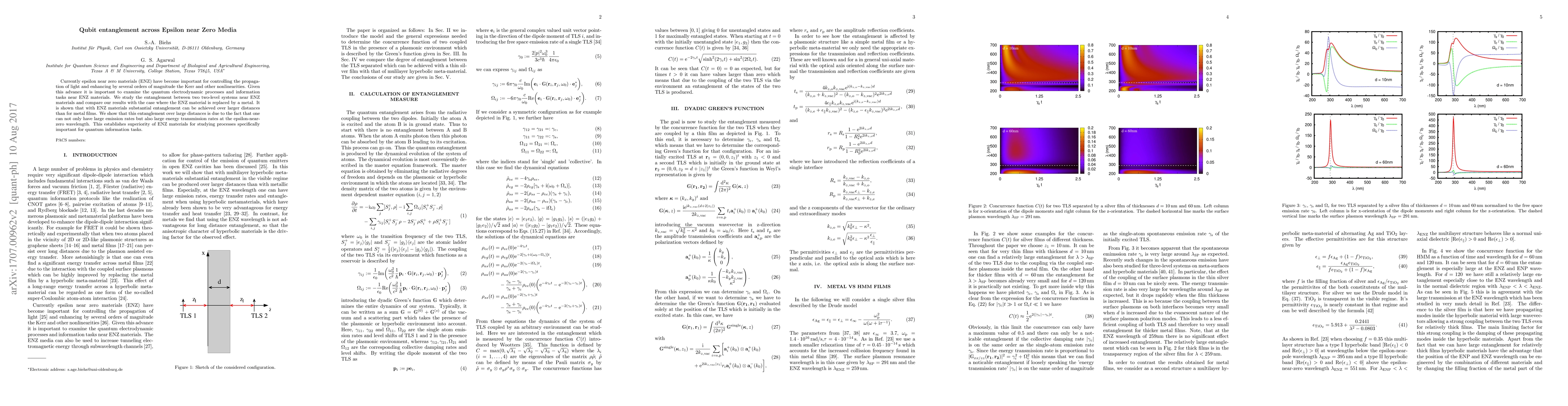 This paper investigates the entanglement between qubits near epsilon near zero (ENZ) materials, demonstrating that ENZ materials can achieve substantial qubit entanglement over larger distances compared to metals. The enhanced entanglement is attributed to both high emission rates and energy transmission rates at the ENZ wavelength, highlighting ENZ materials' superiority for quantum information tasks.