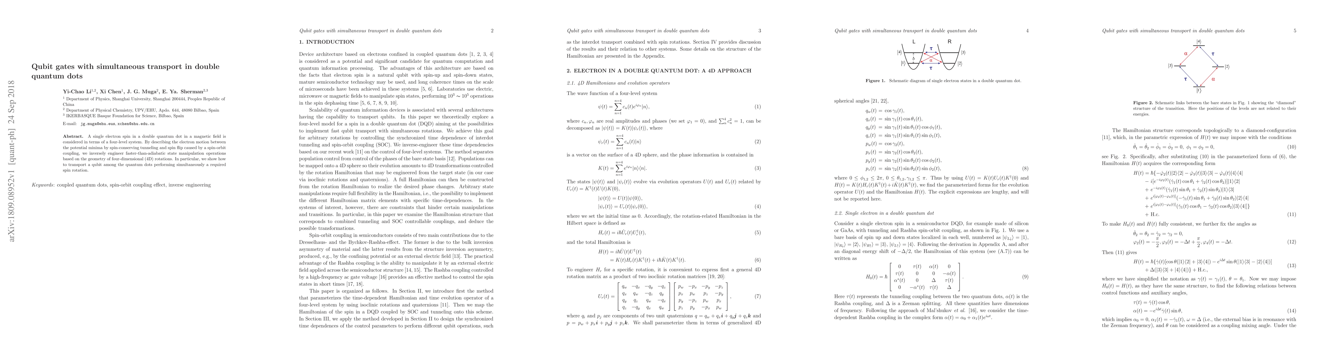 A single electron spin in a double quantum dot in a magnetic field is considered in terms of a four-level system. By describing the electron motion between the potential minima by spin-conserving tunneling and spin flip caused by a spin-orbit coupling, we inversely engineer faster-than-adiabatic state manipulation operations based on the geometry of four-dimensional (4D) rotations. In particular, we show how to transport a qubit among the quantum dots performing simultaneously a required spin rotation.